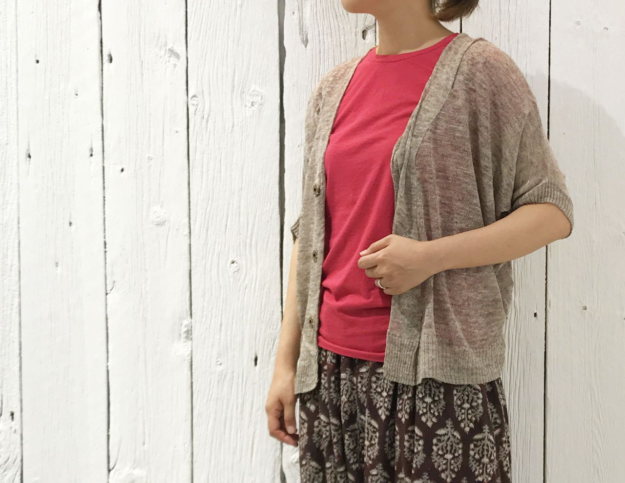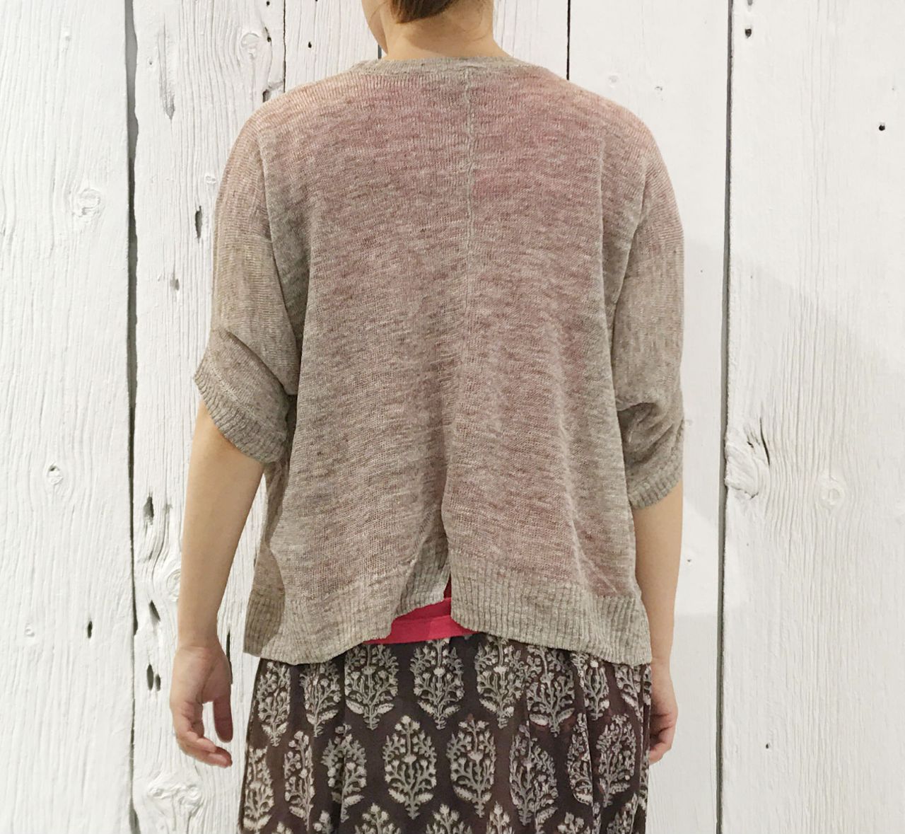ゆったり編まれたリネン素材のカーディガンを羽織ると、中のピンクが透けて涼しげに見えます。