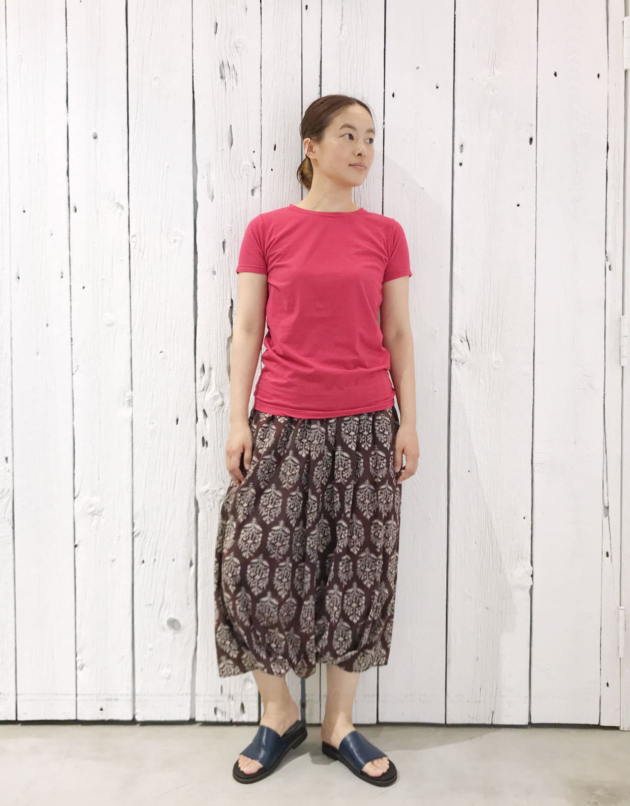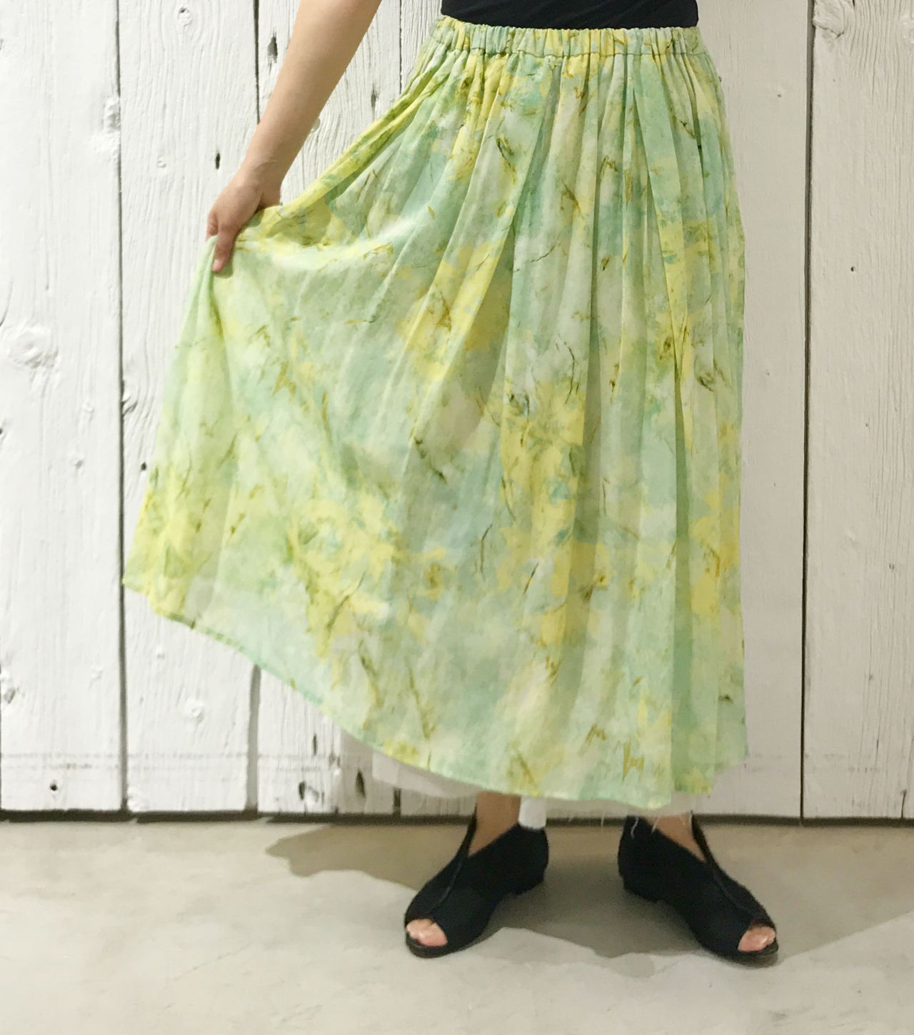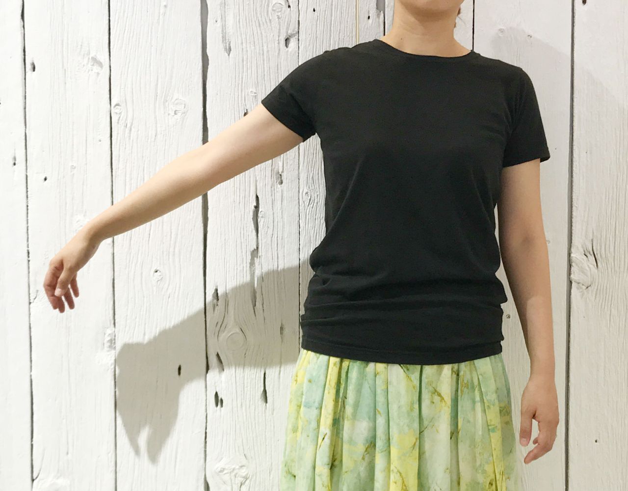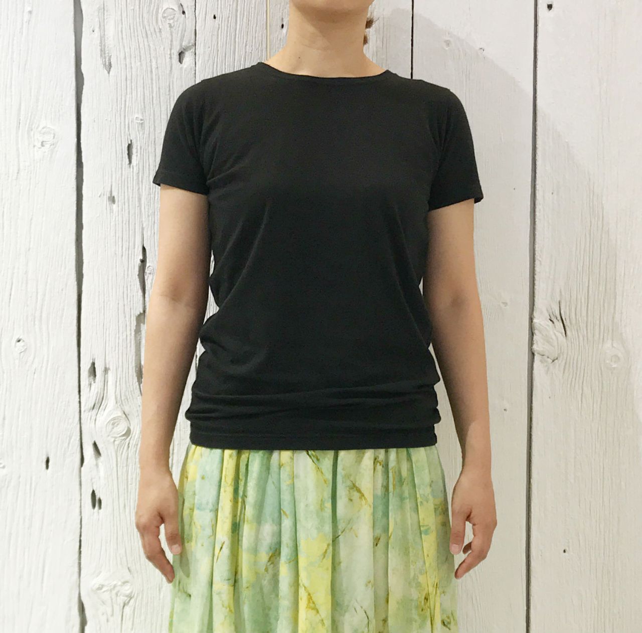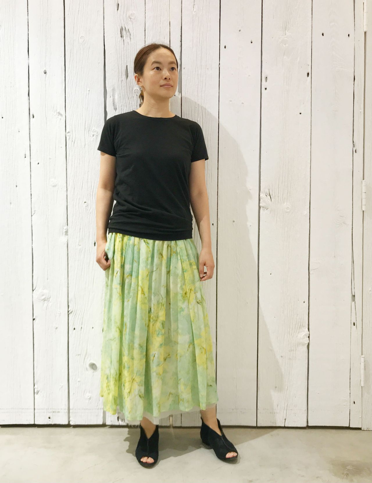 かわいらしい雰囲気になる柄スカートなので、クロのTシャツでピリッと。