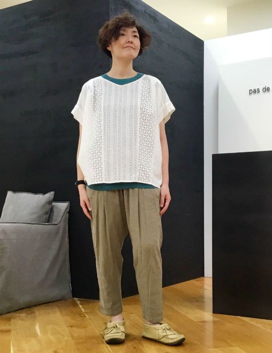 白のレースブラウスのインに着て、チラッと見えたグリーンをポイントに。