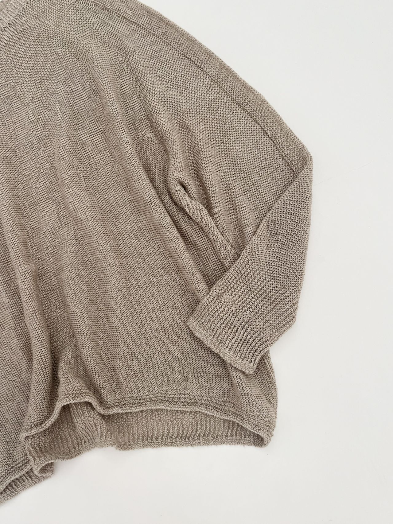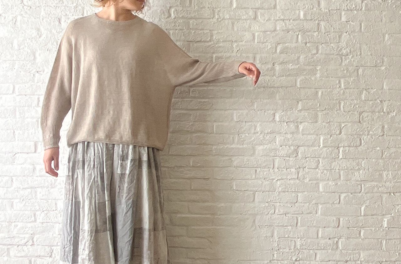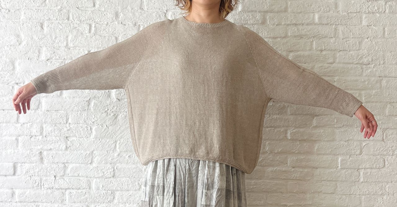 春のニットなのでざっくりと緩やかに編まれており、ホールガーメントで編み立てているため、麻の毛羽立ちや引っ掛かりが軽減されてリネン独特の美しい光沢が際立つのも特徴の1つ。