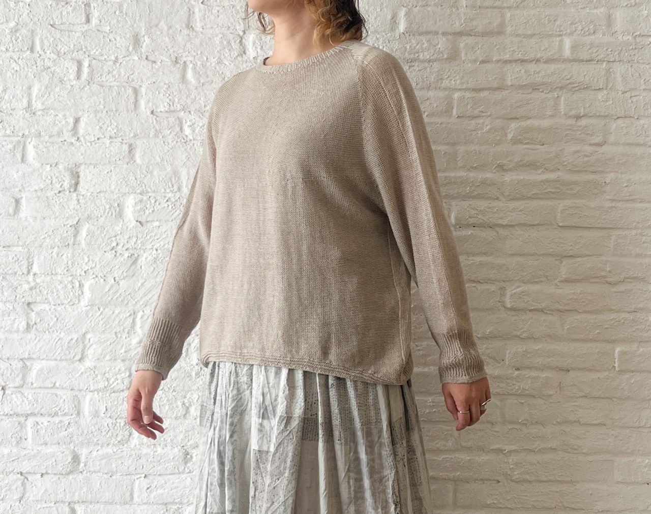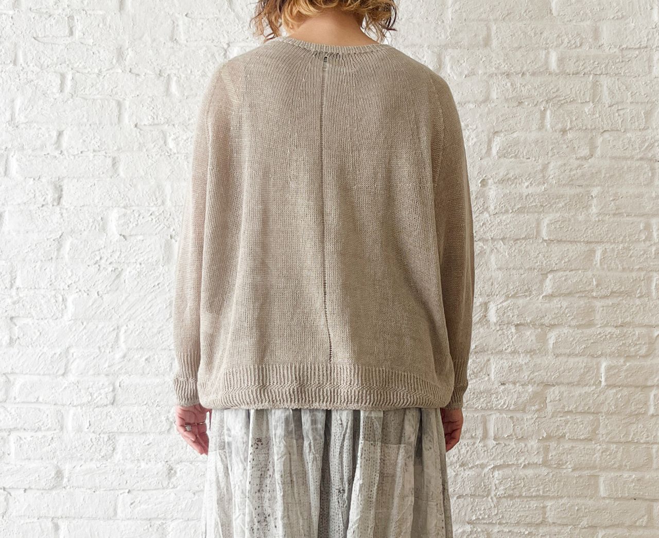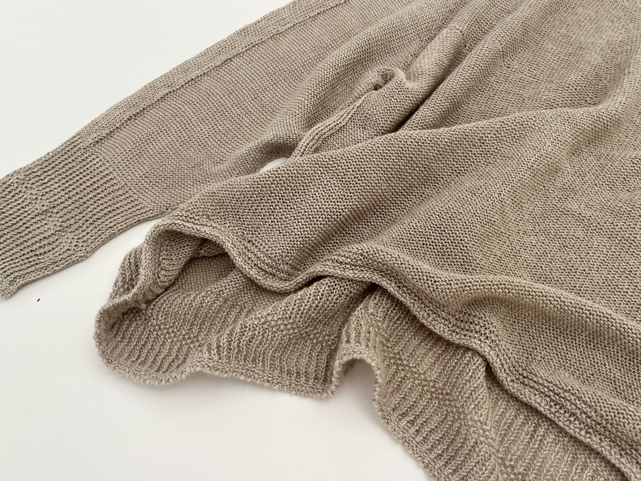 春のニットなのでざっくりと緩やかに編まれており、ホールガーメントで編み立てているため、麻の毛羽立ちや引っ掛かりが軽減されてリネン独特の美しい光沢が際立つのも特徴の1つ。