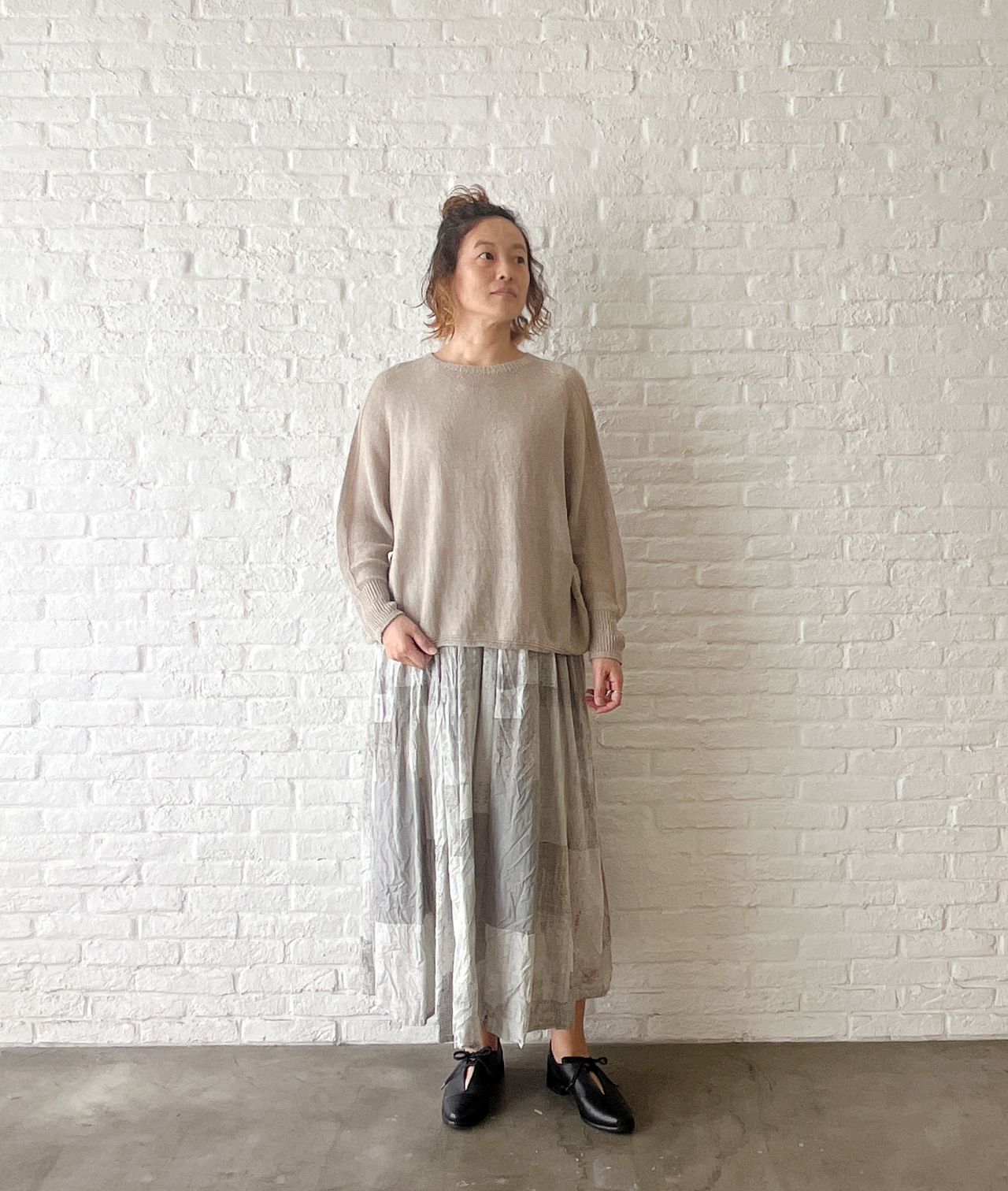 ライトグレーな色味なので、明るめなトップスと合わせると季節感が出ます。