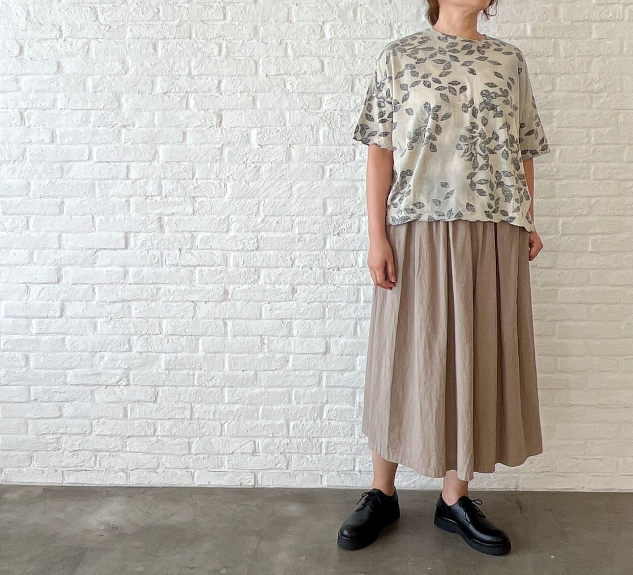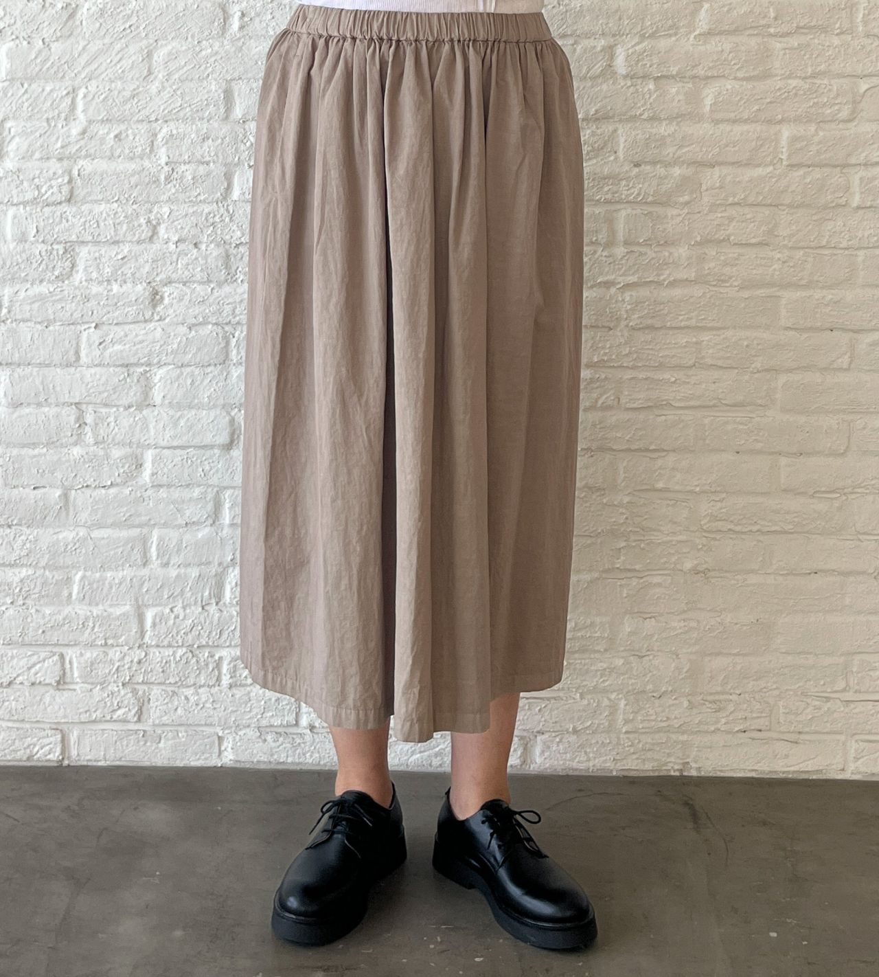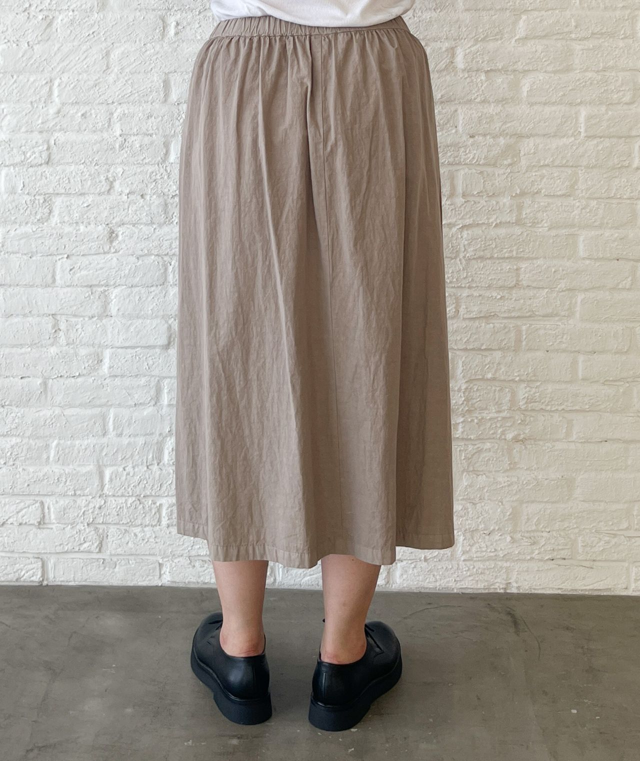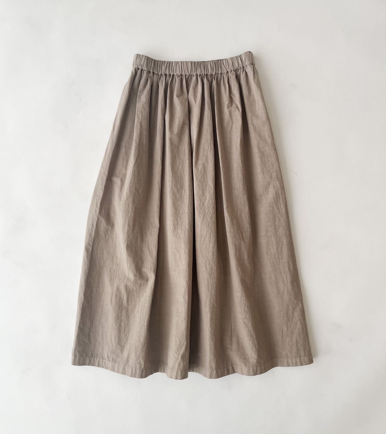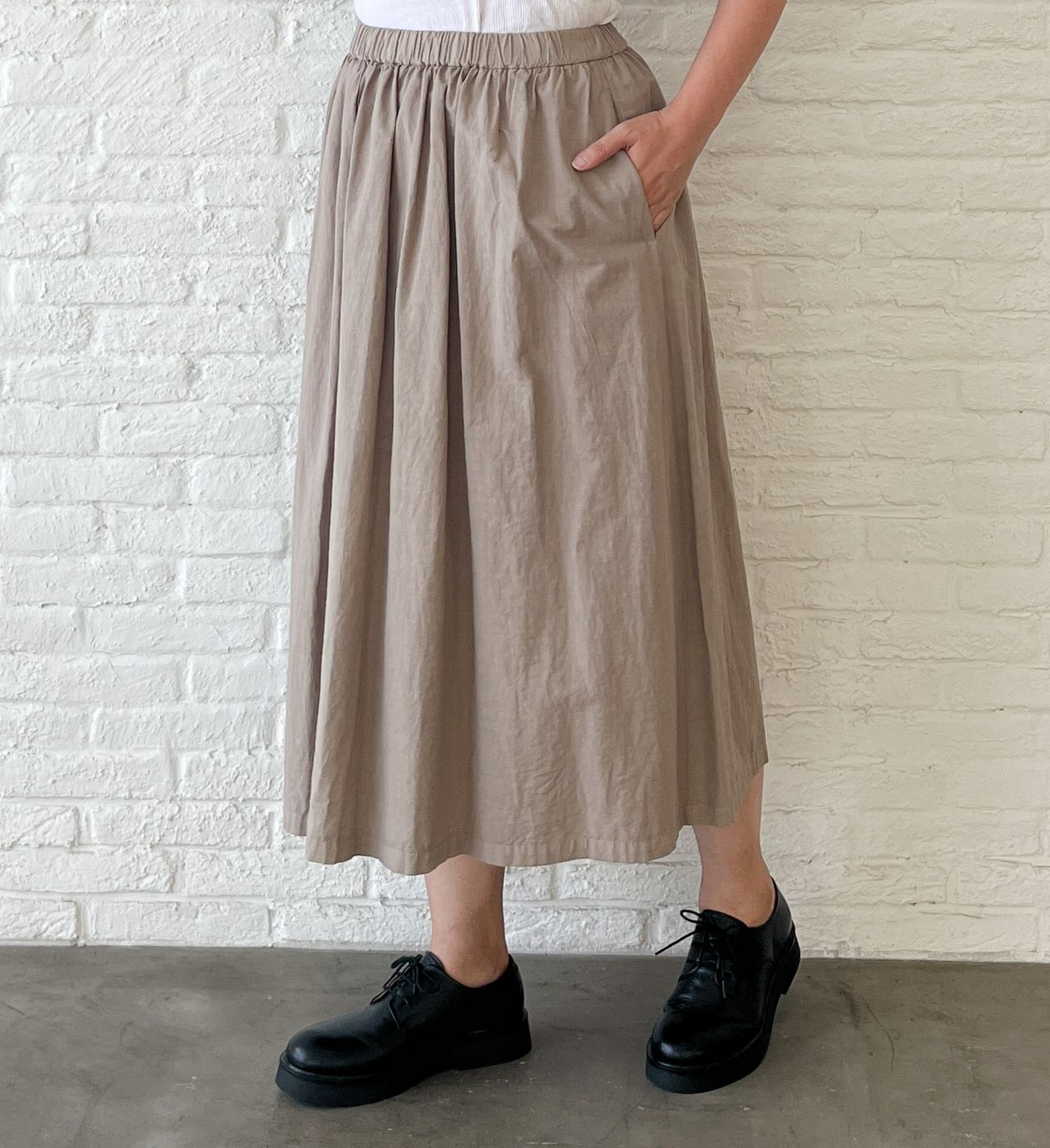 何にでも合わせやすい、無地のギャザーロングスカート。