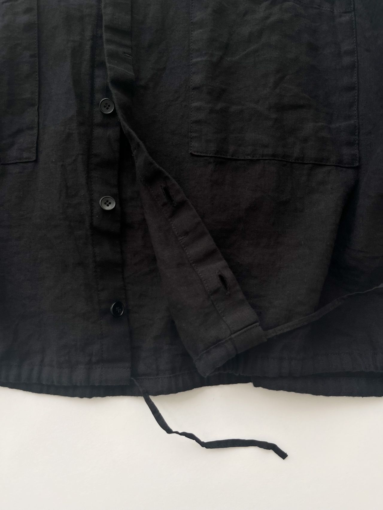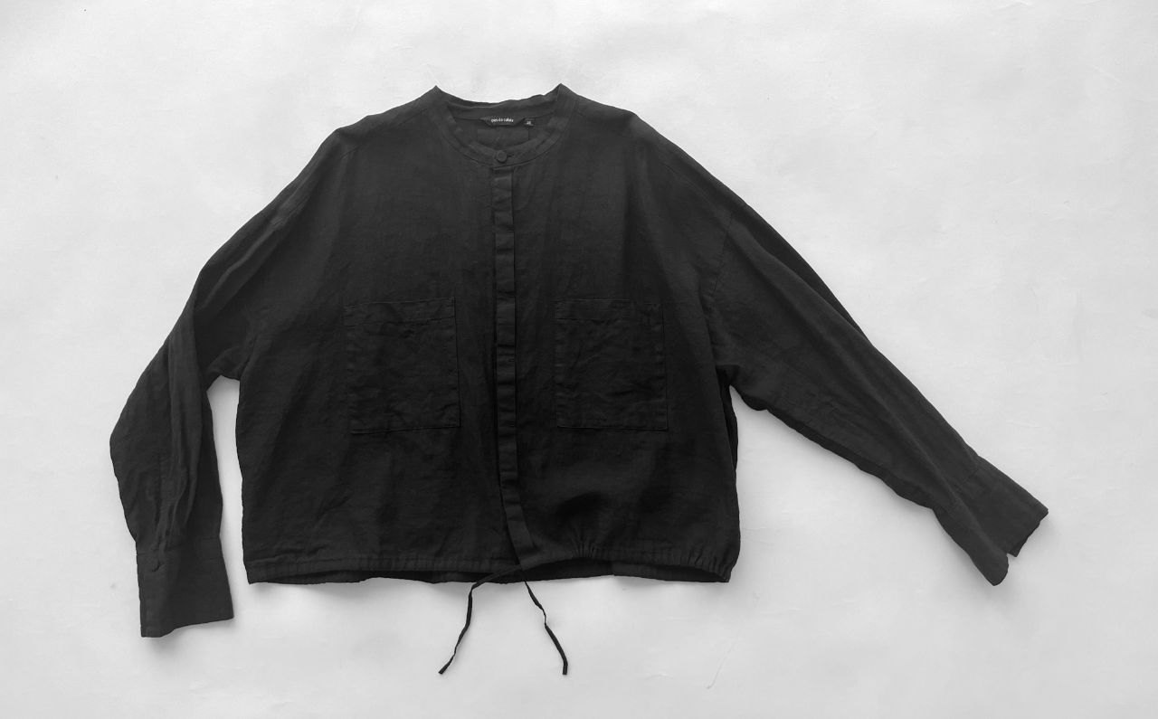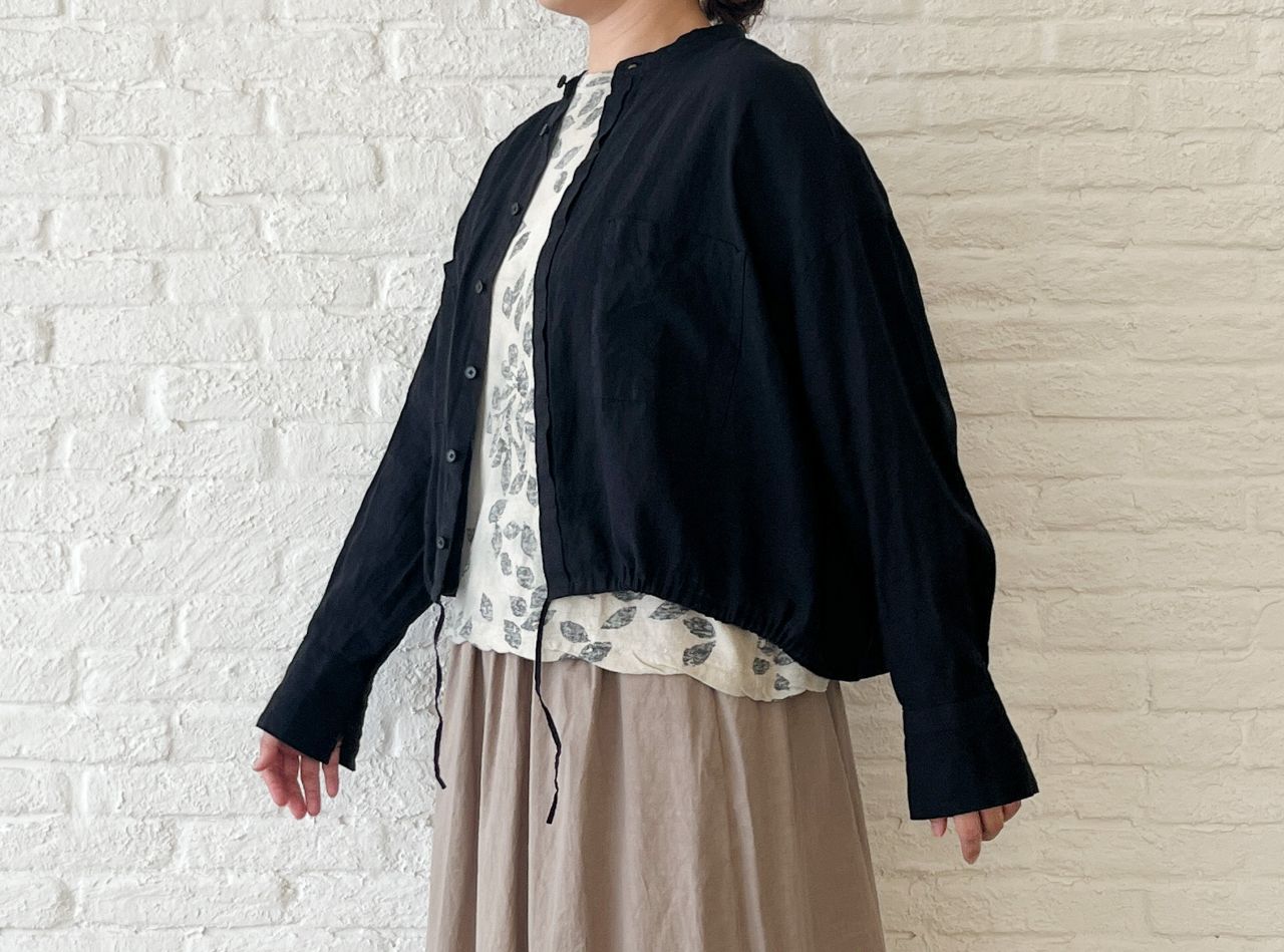 裾に紐がはいっているので、キュッと絞って着ていただくこともできる、バランスがかわいいシャツジャケットです。