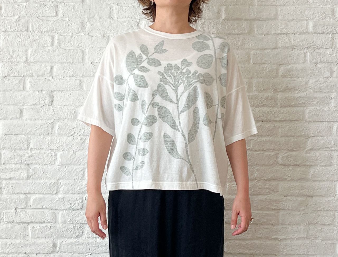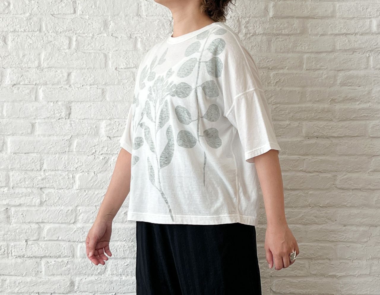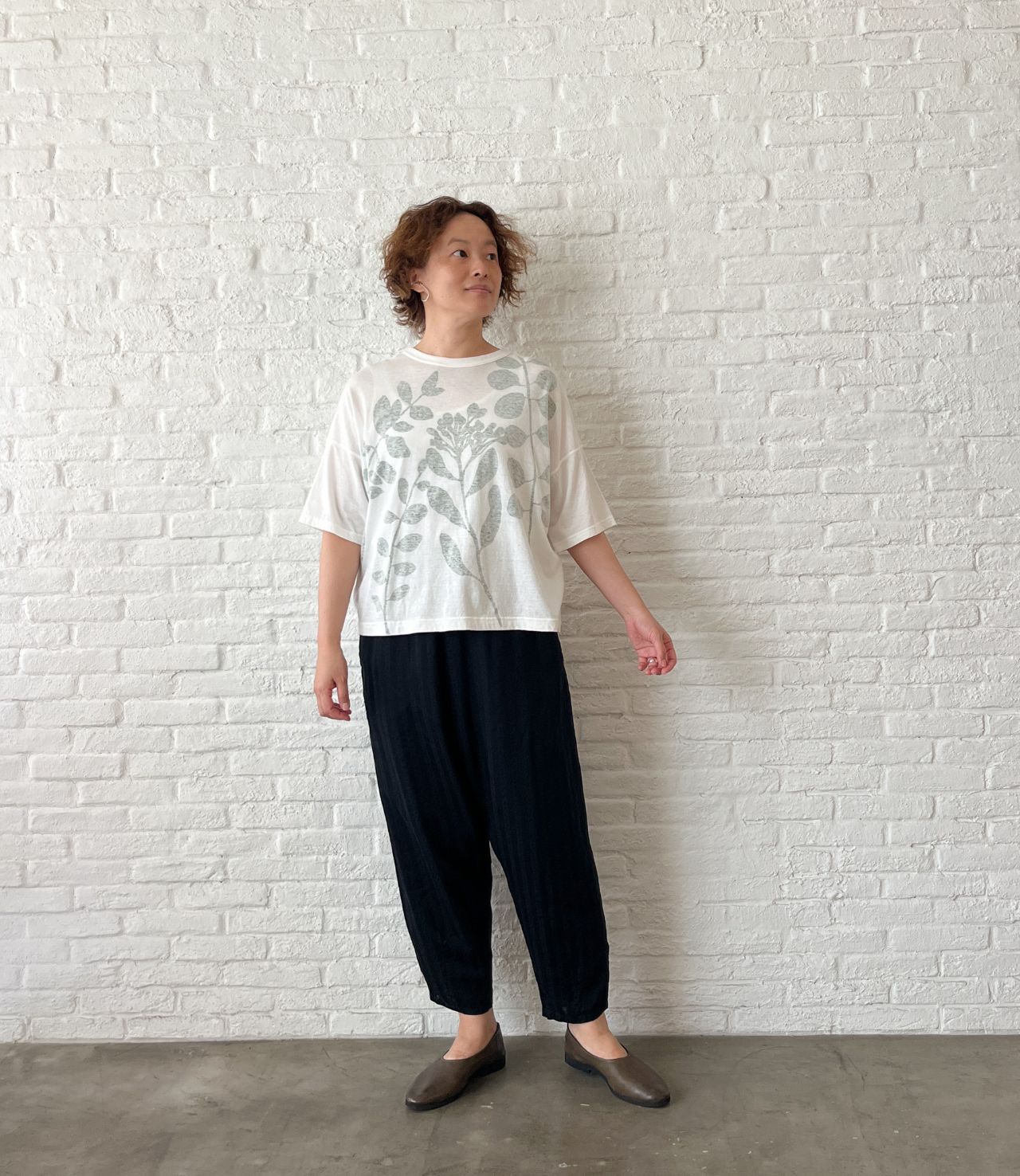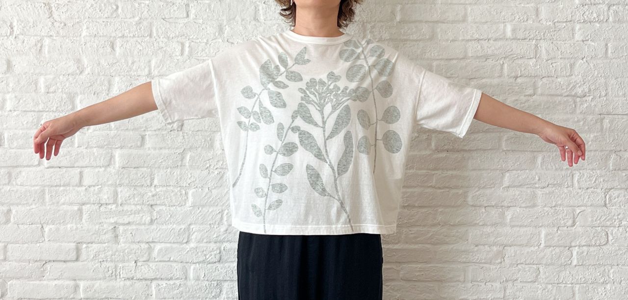 トルマリンなどのボタニカルダイで染め上げた、前面の楊柳素材がふんわりと軽いTシャツです。