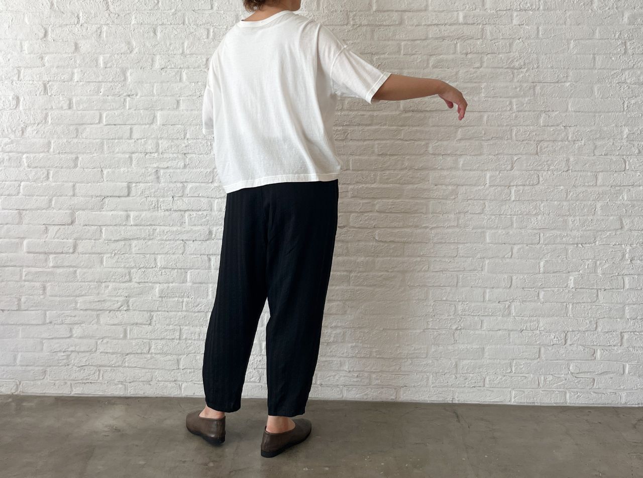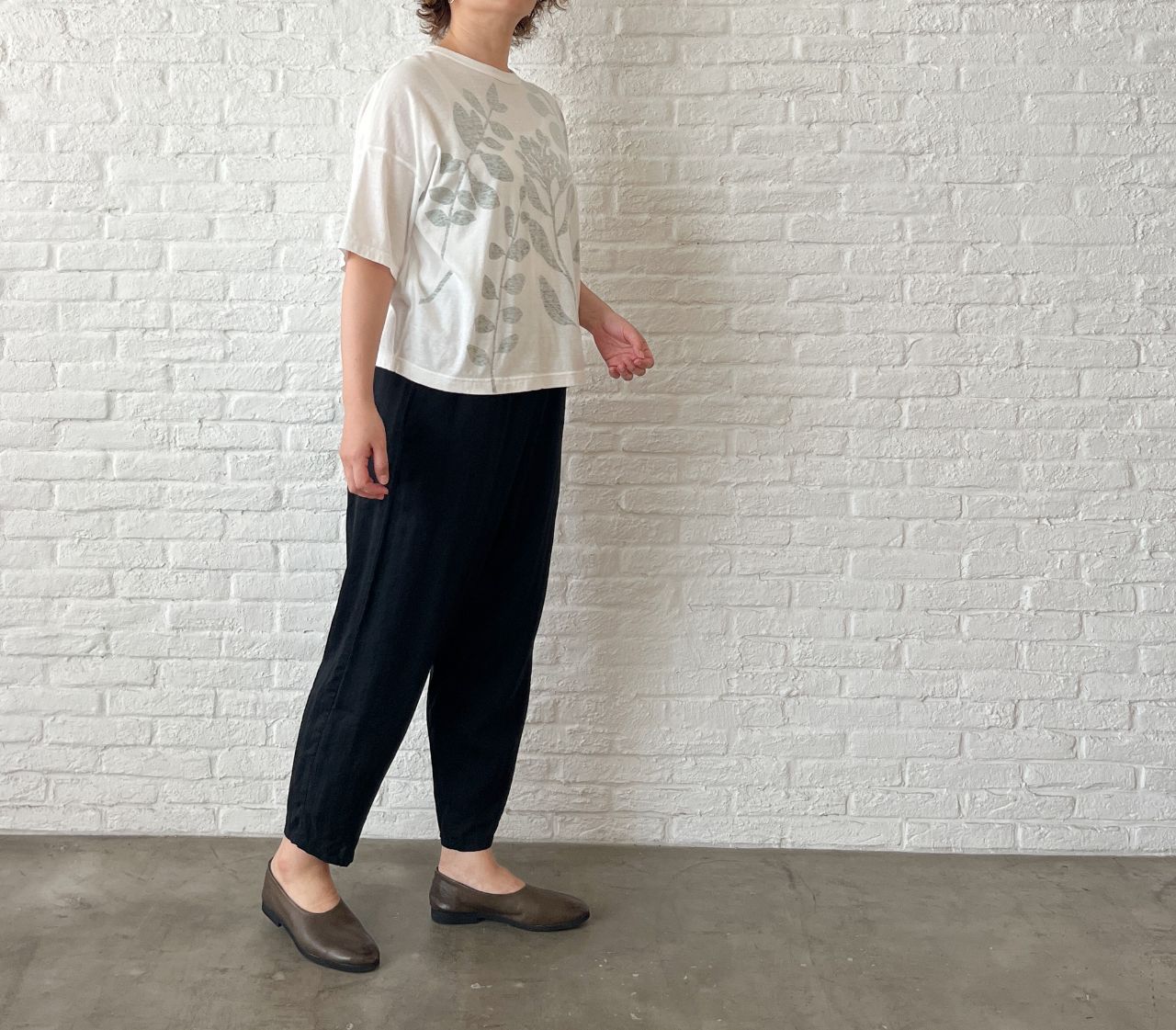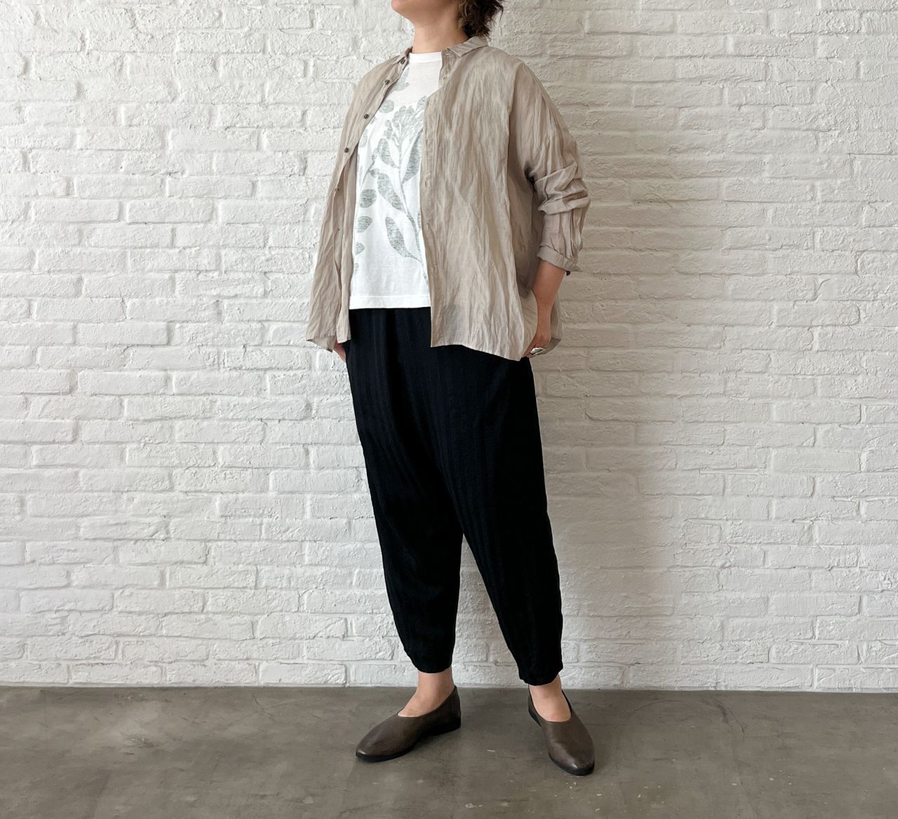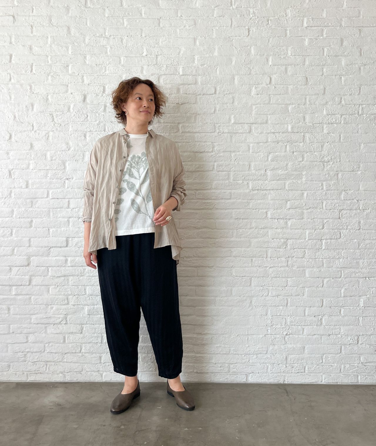 トルマリンなどのボタニカルダイで染め上げた、前面の楊柳素材がふんわりと軽いTシャツです。