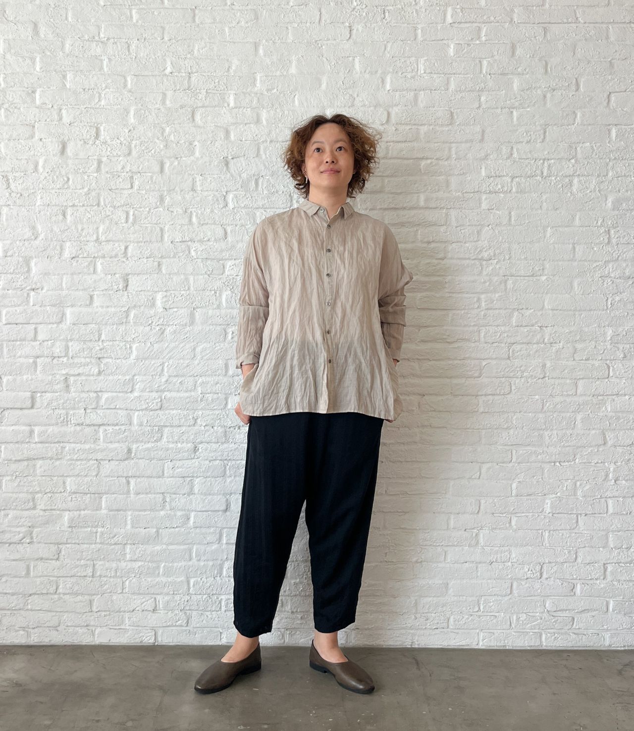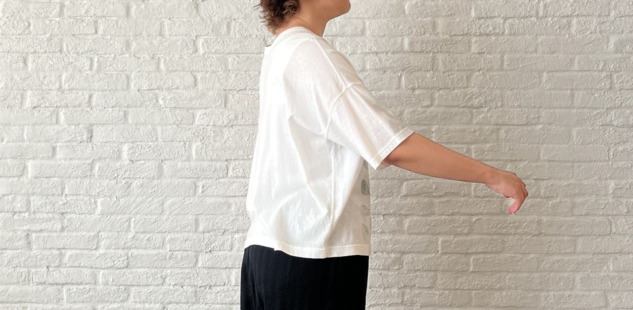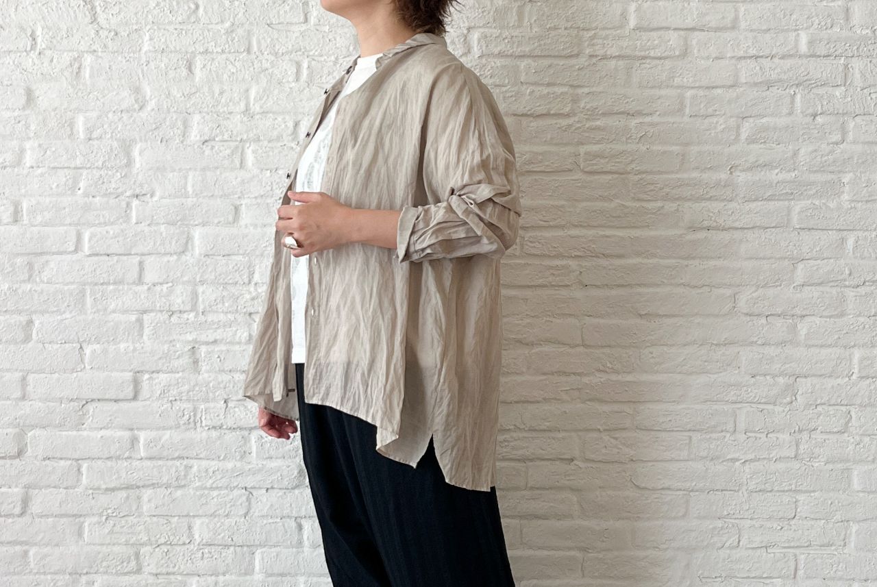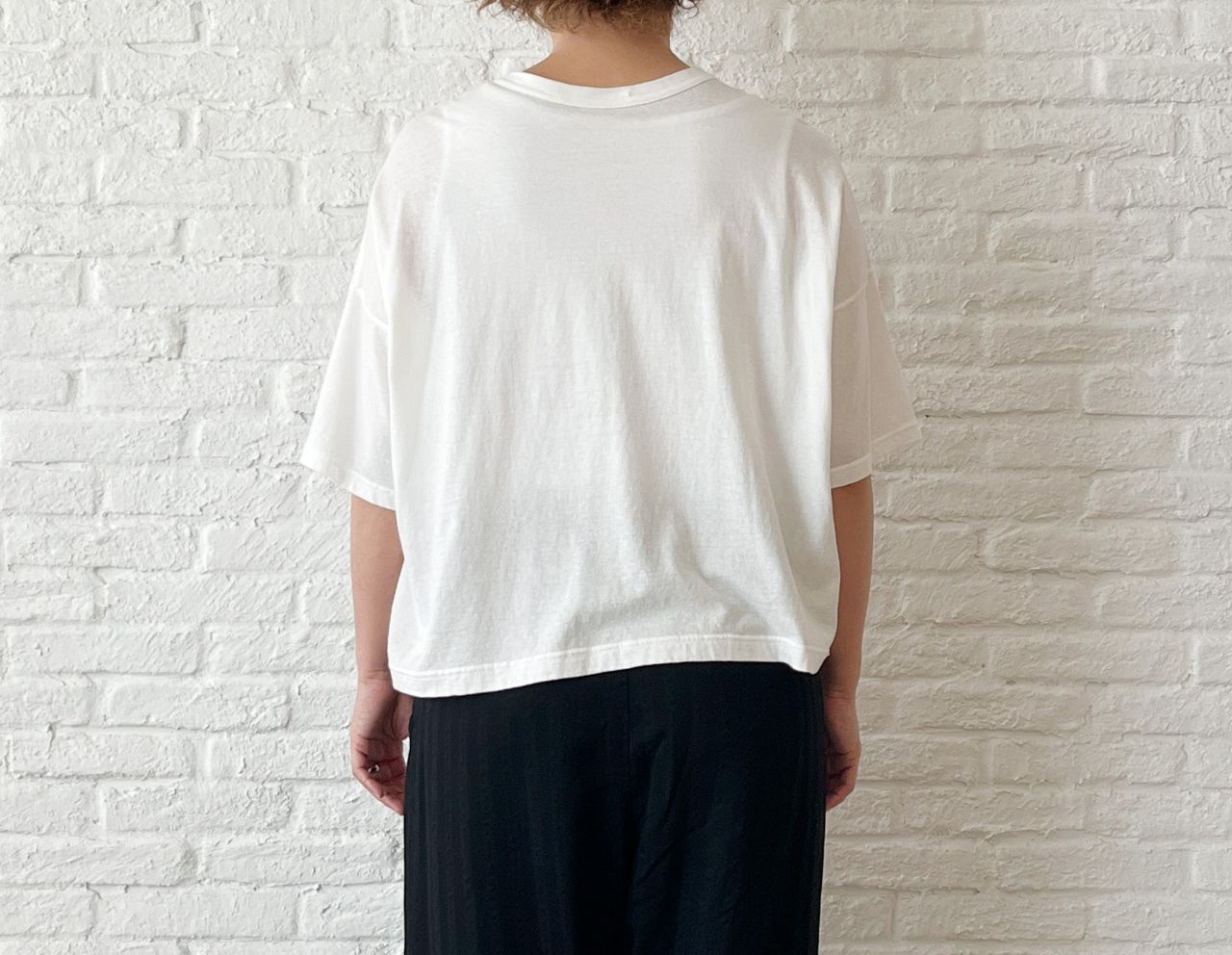 トルマリンなどのボタニカルダイで染め上げた、前面の楊柳素材がふんわりと軽いTシャツです。
