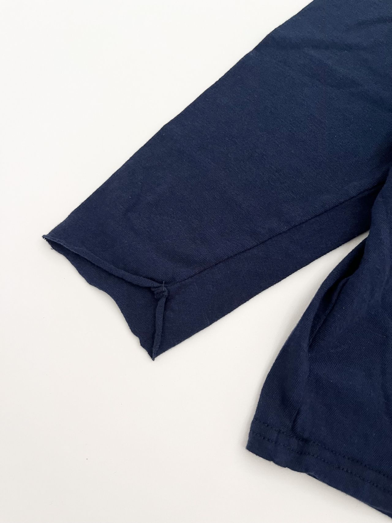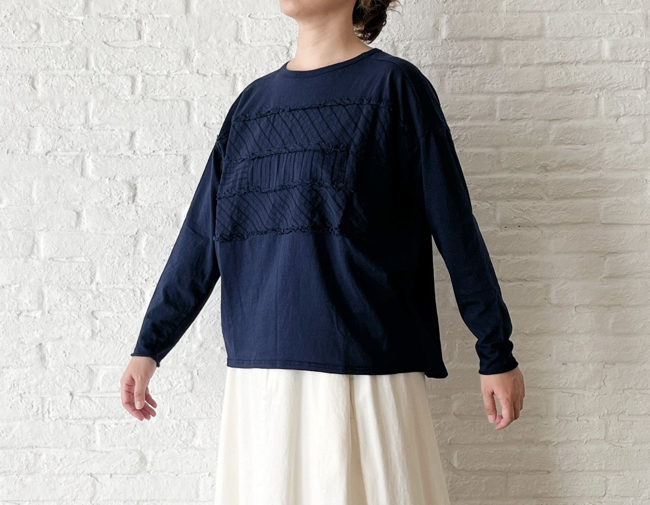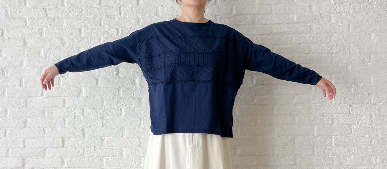 前身頃に、布帛素材を2素材切り替えて製品染めを行った、秋の涼しい季節から着やすい長袖タイプ。