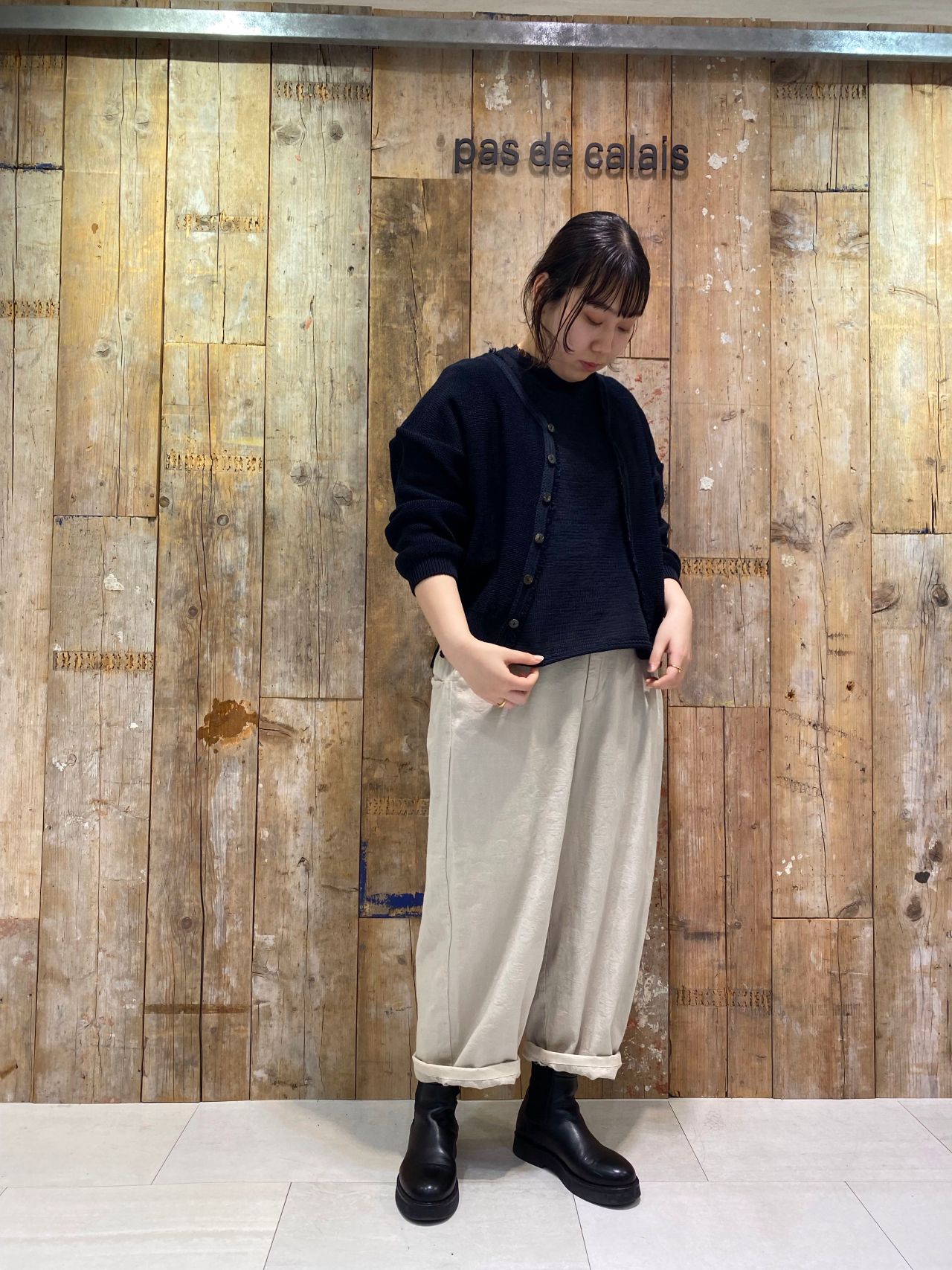 緩やかなカーブを描いたシルエットで、前はボタンとファスナー開き、ウエスト部分はゴム仕様になっているため、着脱のしやすいデザインとなっています。