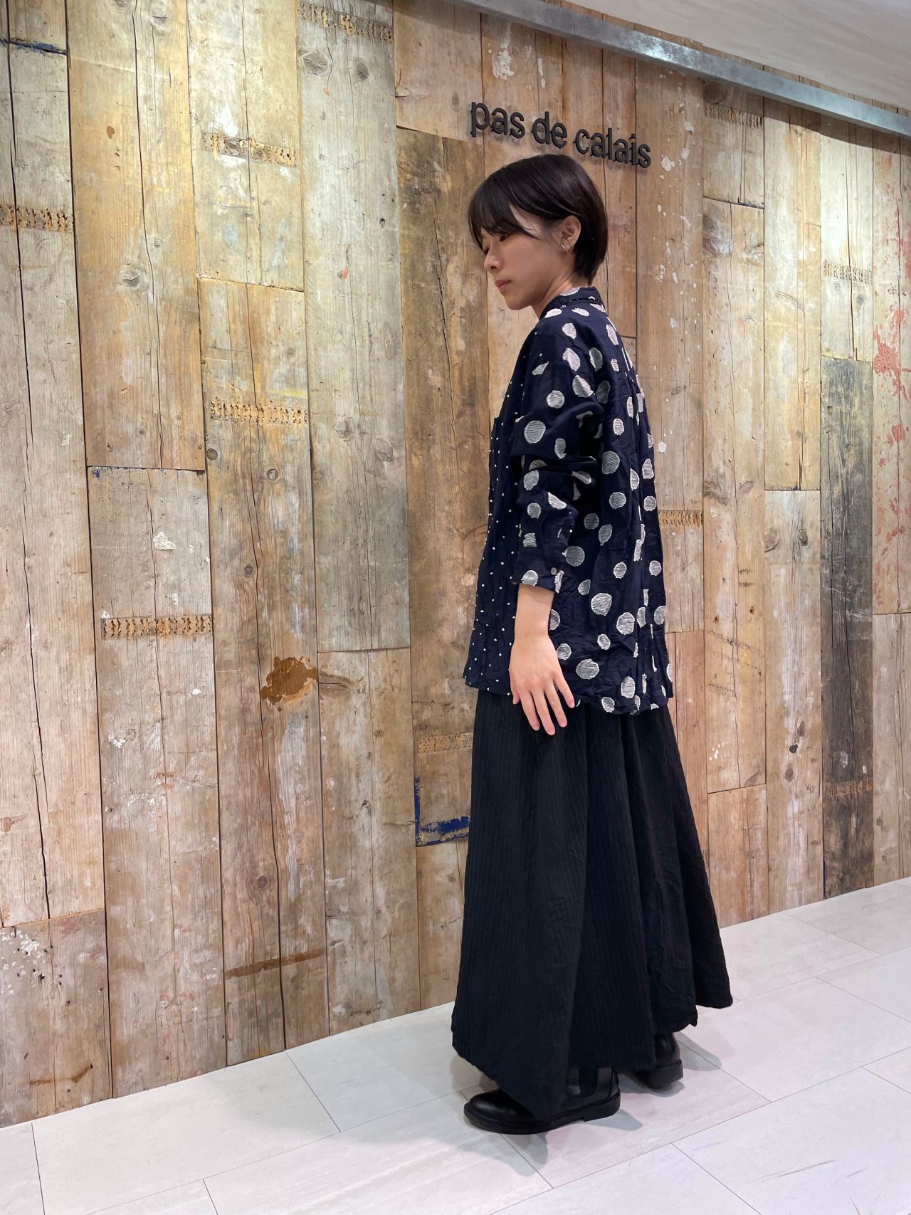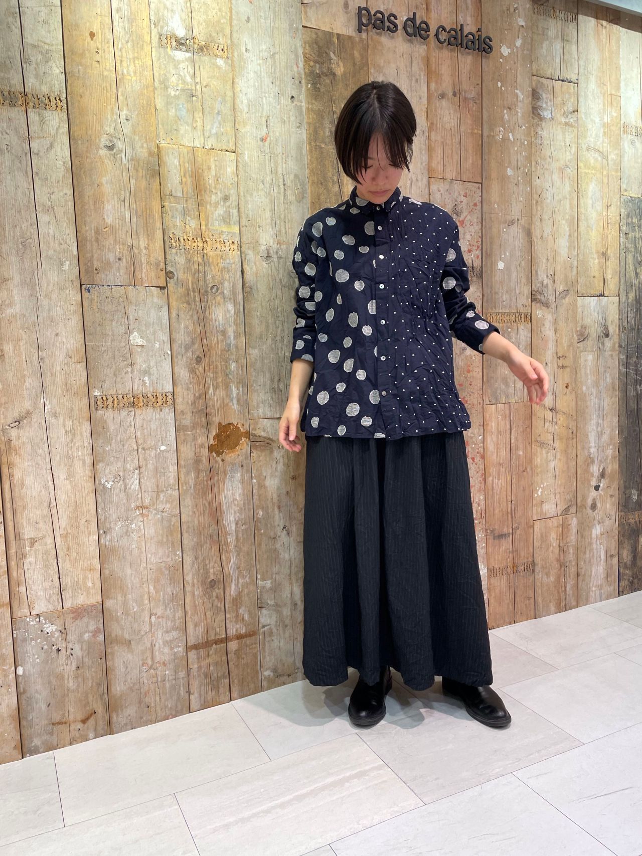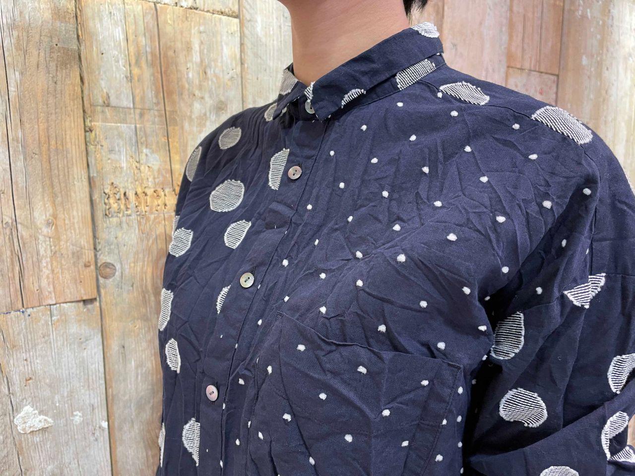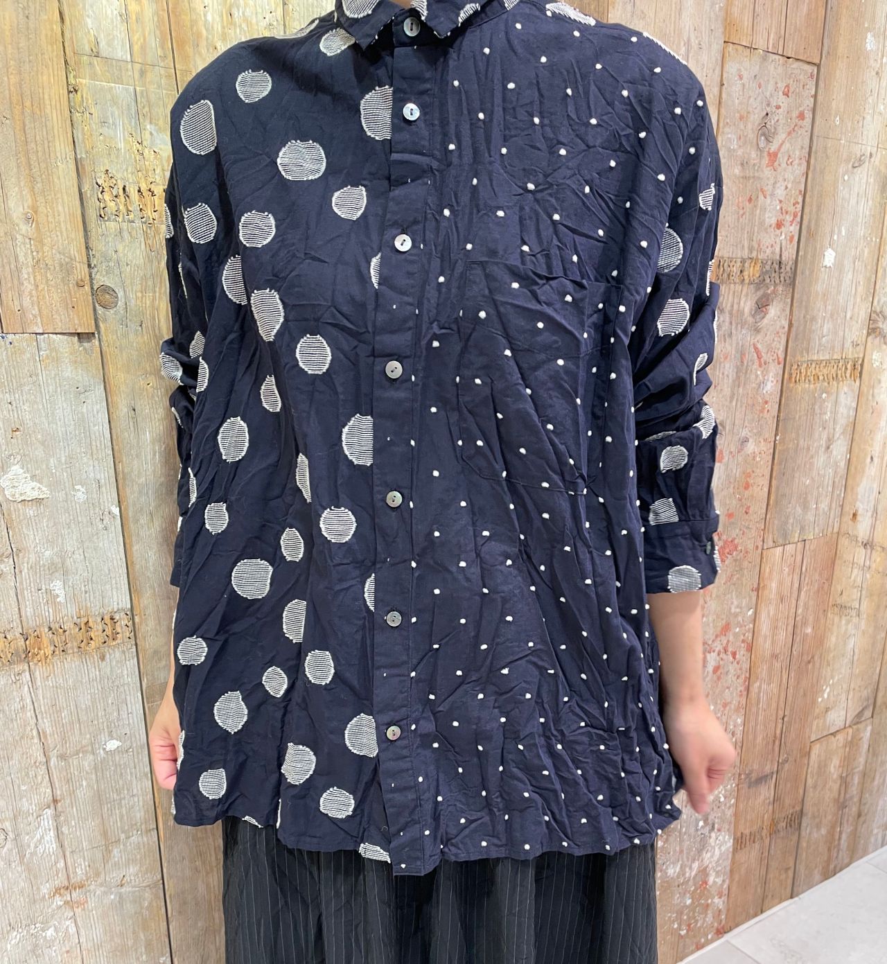大きさの異なるドット柄が印象的なブラウス。