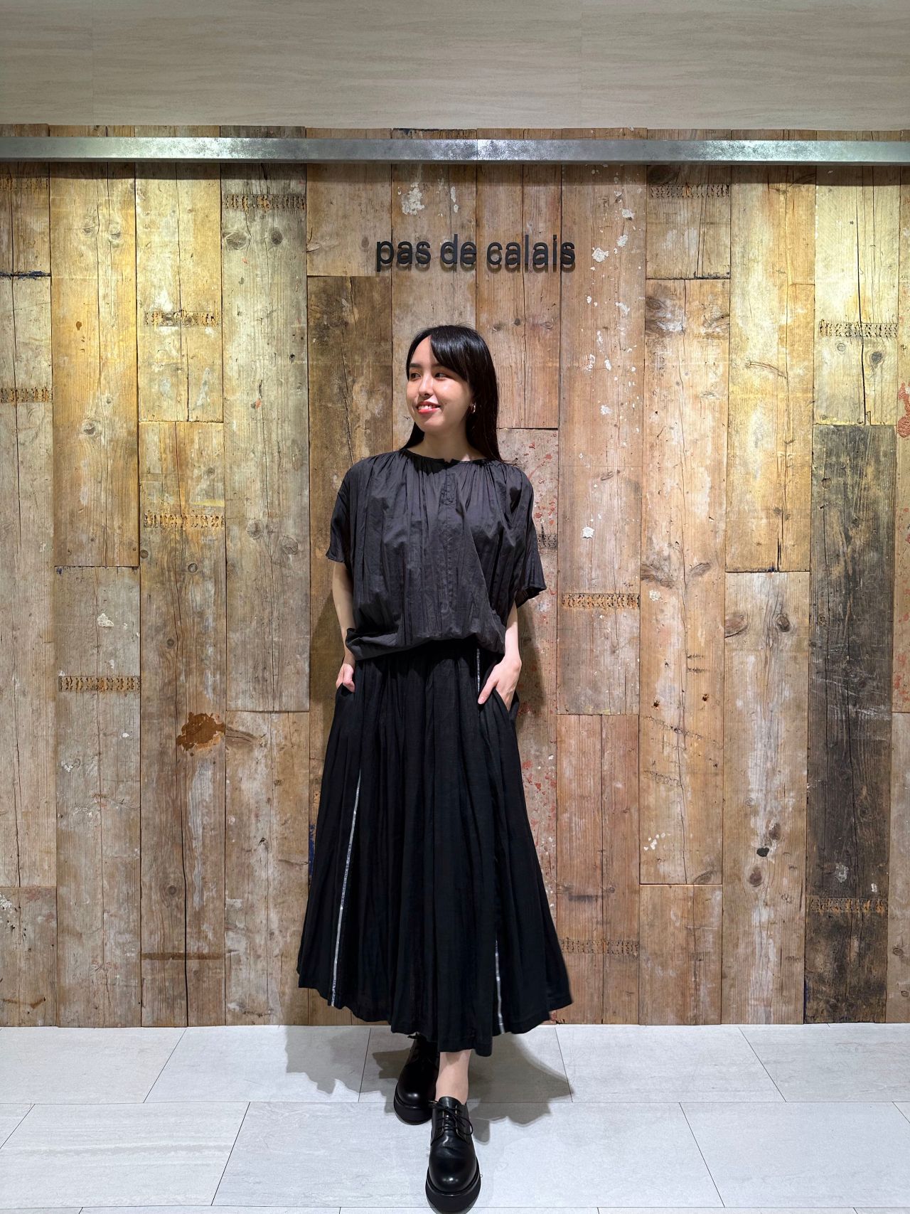 今回のように黒のスカートとシューズを合わせた、ワントーンコーディネートもオススメ。