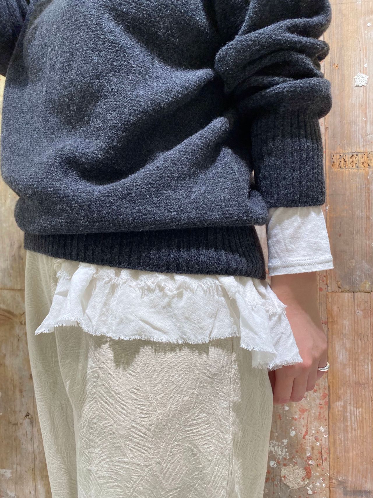 今回のようにインナーにフリル付きカットソーをレイヤードするスタイリングもおすすめです。
