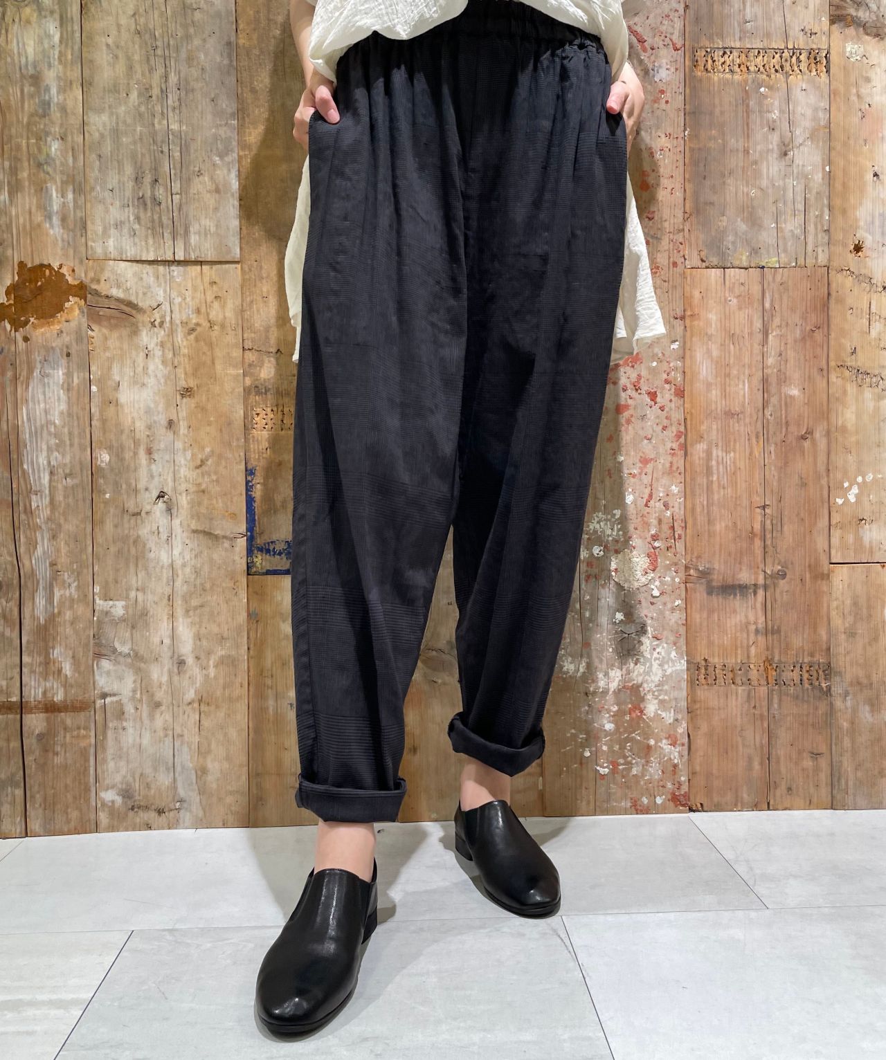 フレンチリネンの清涼感あるさらっとした肌触りと、ストレッチレーヨンの伸縮性でストレスフリーな履き心地となっています。