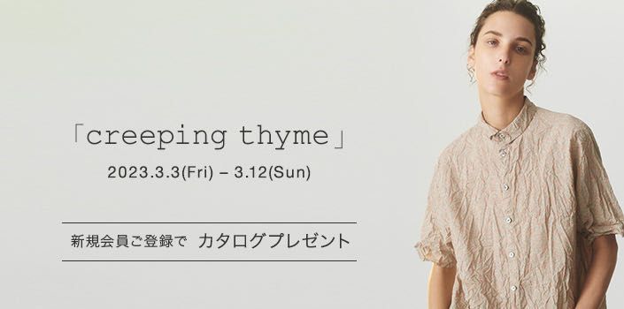 3月3日(金)〜12日(日) 期間中、「creeping thyme」を記念して、新規会員ご登録で、「pas de calais SPRING / SUMMER 2023」のカタログをプレゼントします。(無くなり次第、終了となります。)