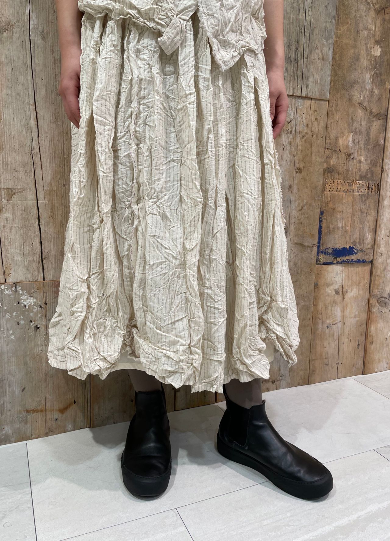 シワ加工が印象的なブラウスとスカートのセットアップ。