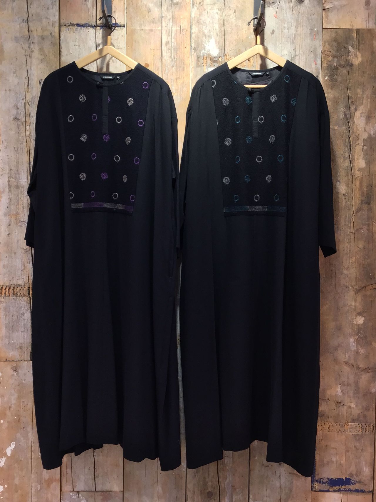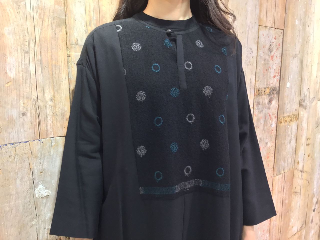縮絨したウールガーゼに、2色の刺繍をリング柄で入れた素材を使用しています。