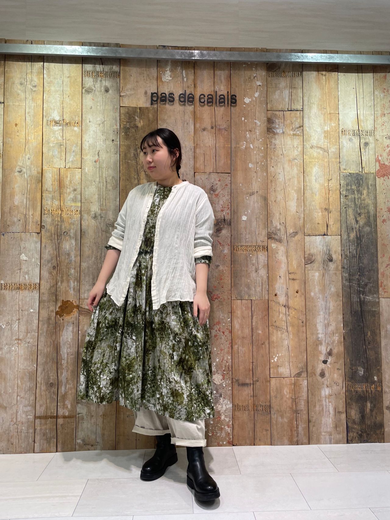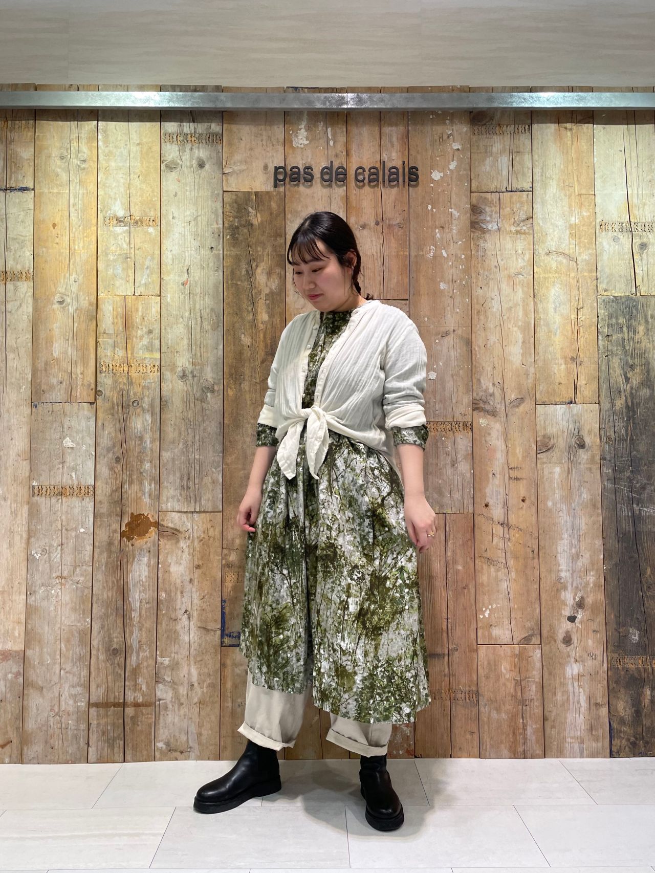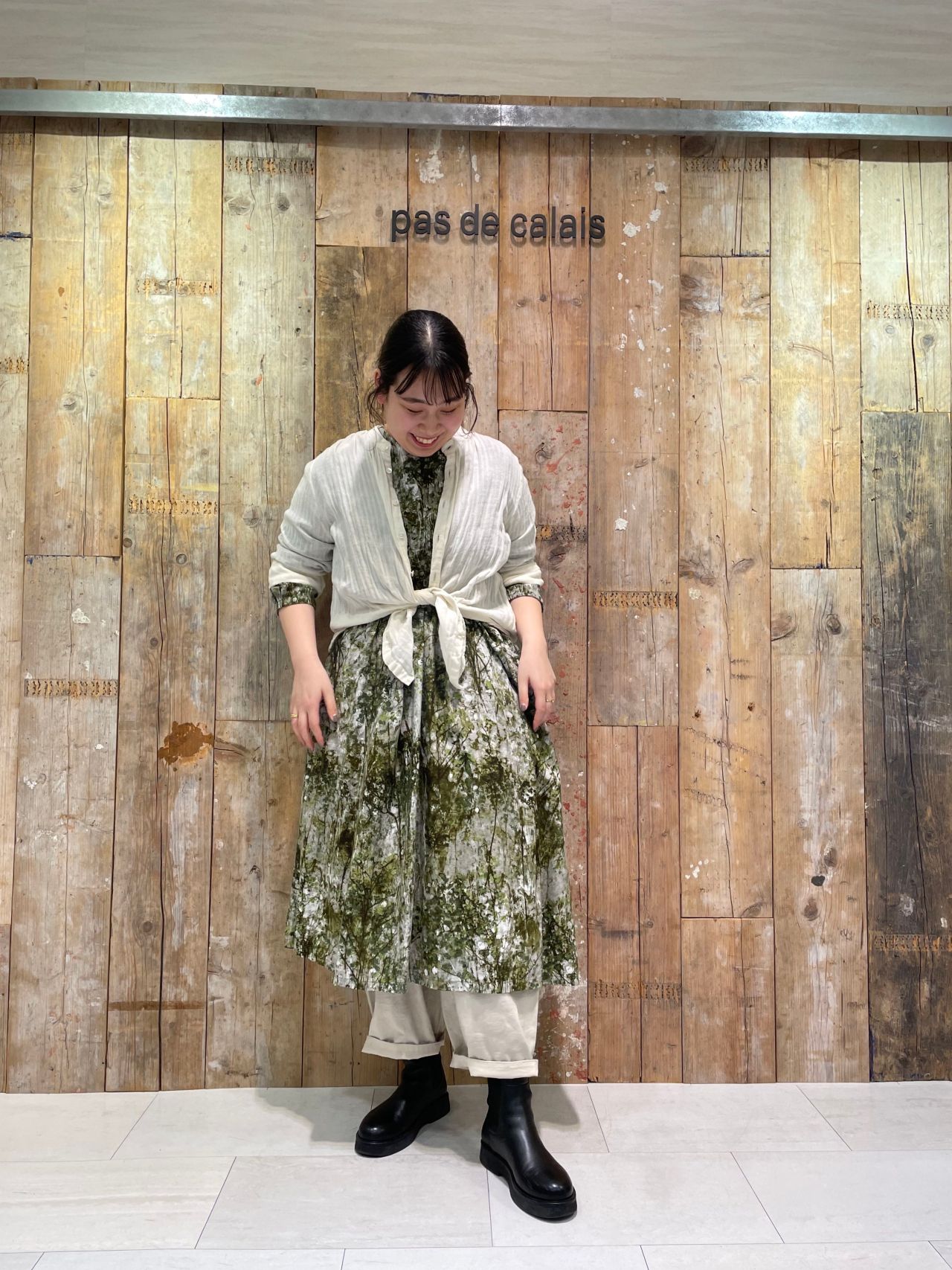 今回はワンピースの下にパンツをINし、アイボリーとグリーンで色味をまとめた春のお出かけにぴったりなコーディネートにしました。