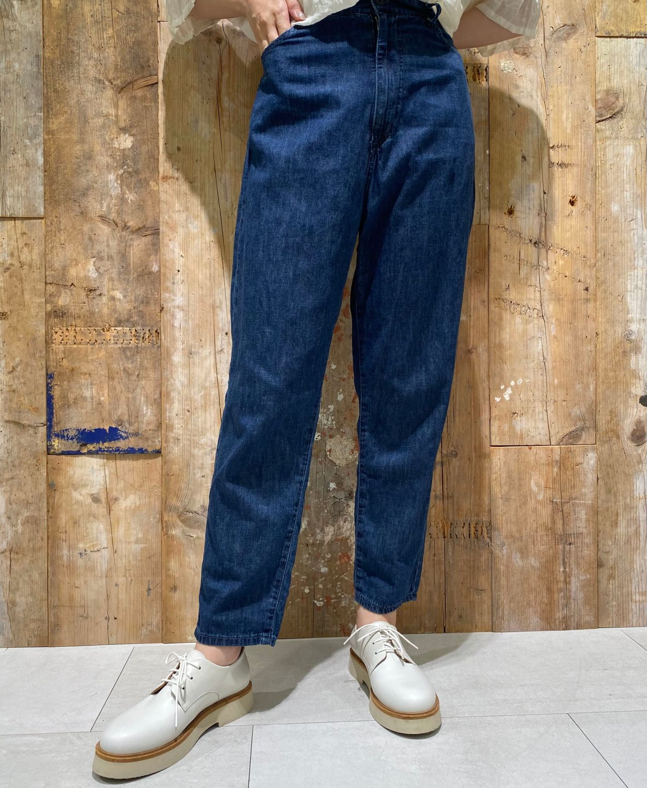 綿麻のデニム生地を、製品にしてからドライウォッシュ加工を施して、しなやかで柔らかい風合いに仕上げたデニムパンツ。