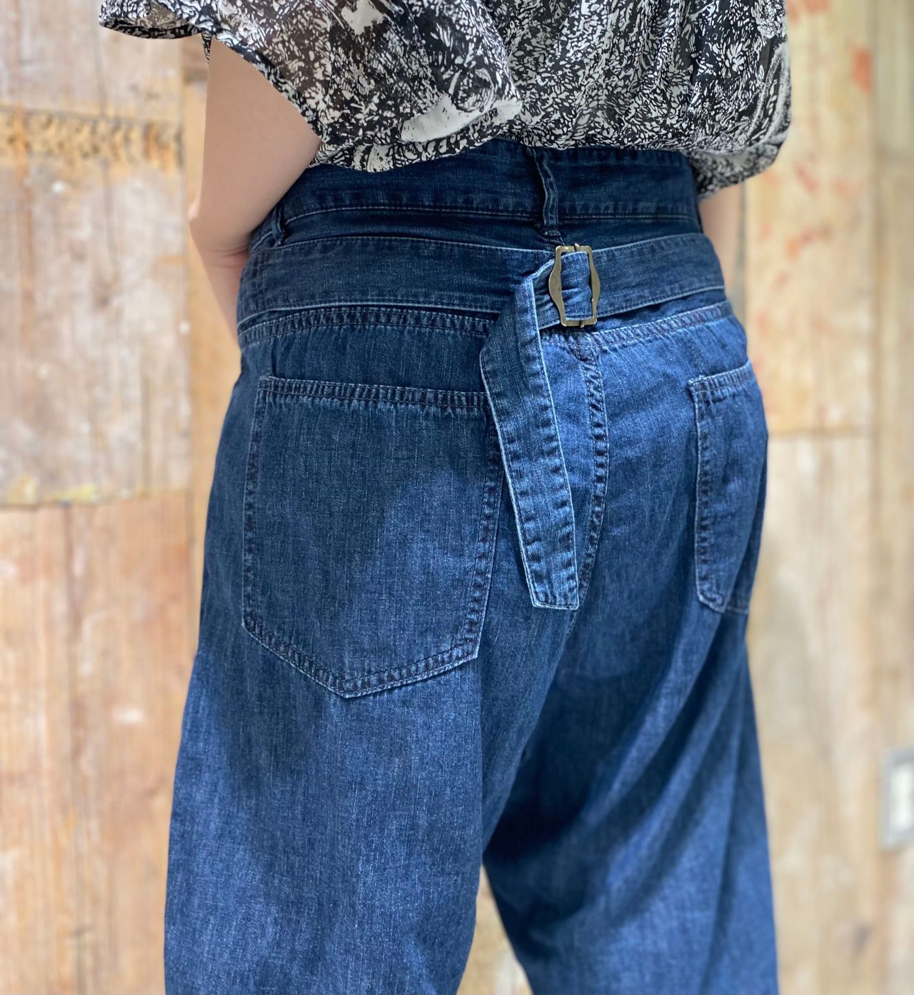 後ろのベルトを絞って、ハイウエストデニムパンツとしても履くこともできます。