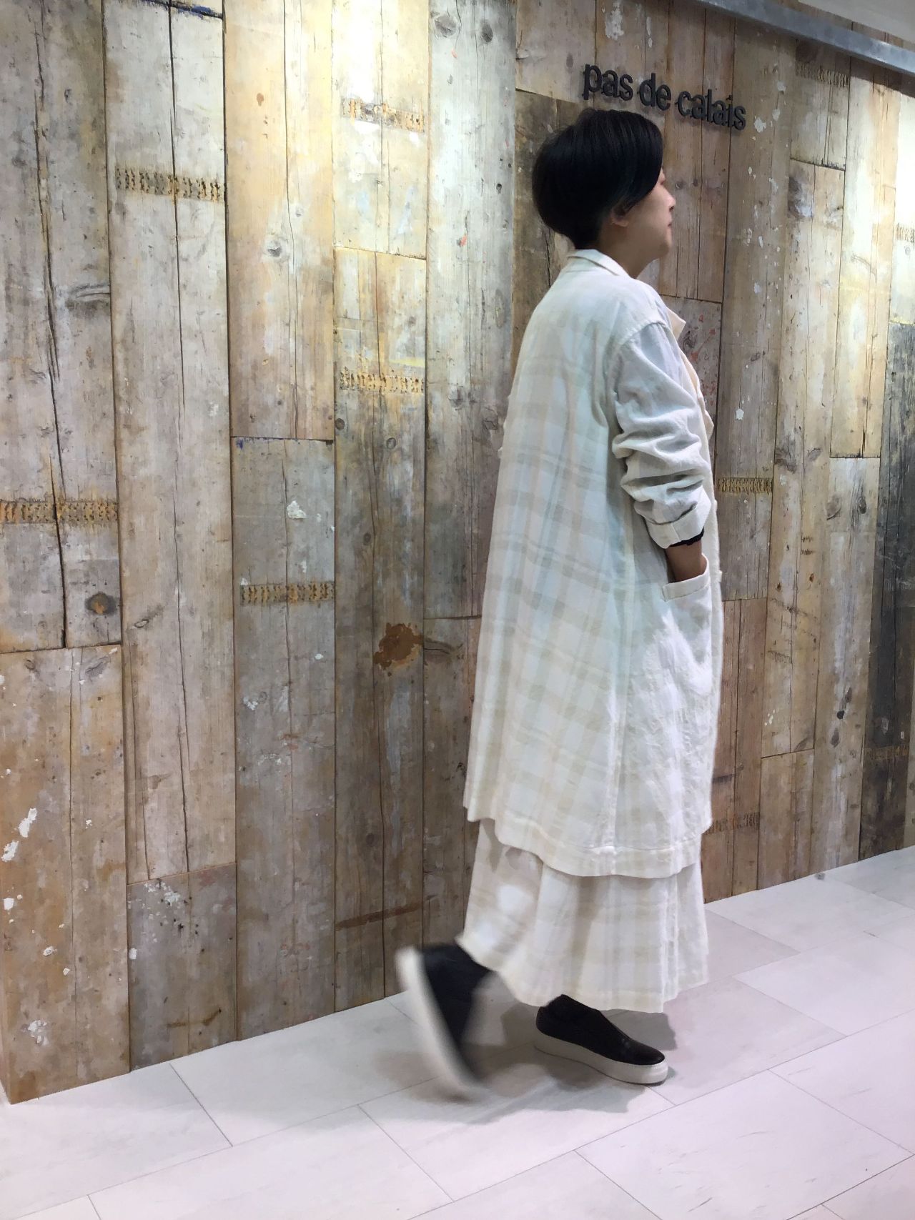コートの中はコットンダブルガーゼのブラウスを着用しています。全体的アイボリーで統一ではなく中に濃い色を入れると引き締まってスッキリと合わして頂けます!