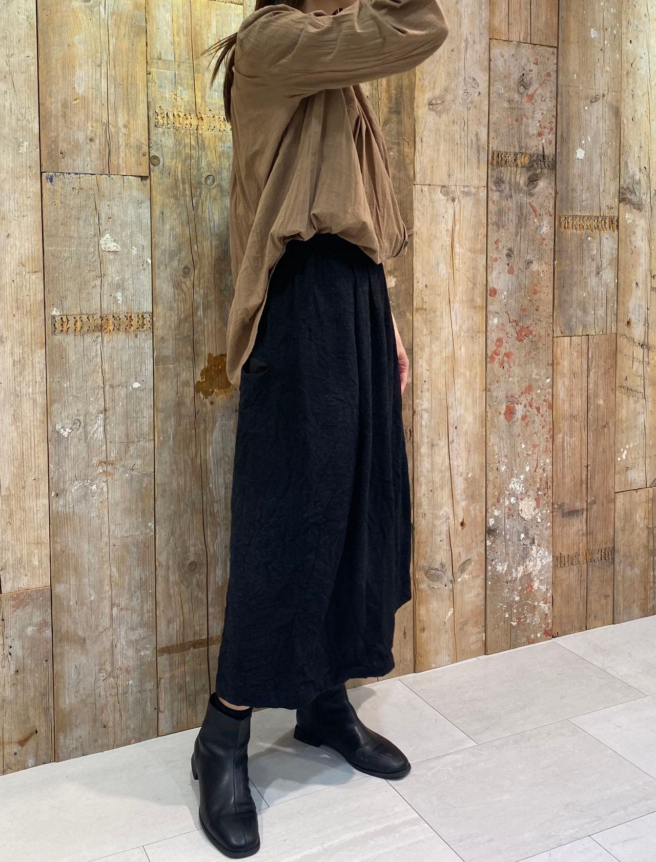着丈が長く適度にボリューム感があり、パンツはもちろん、スカートとも相性が良い1枚です。