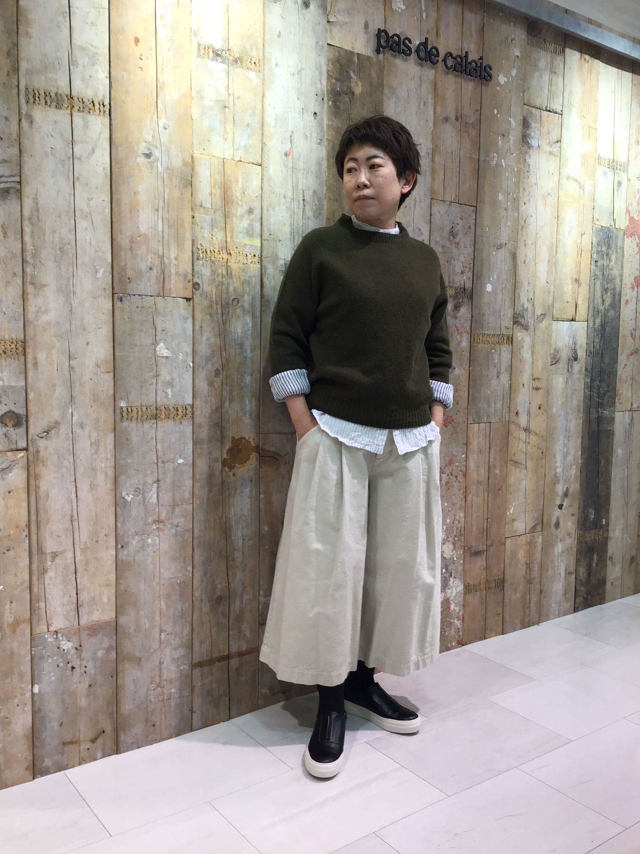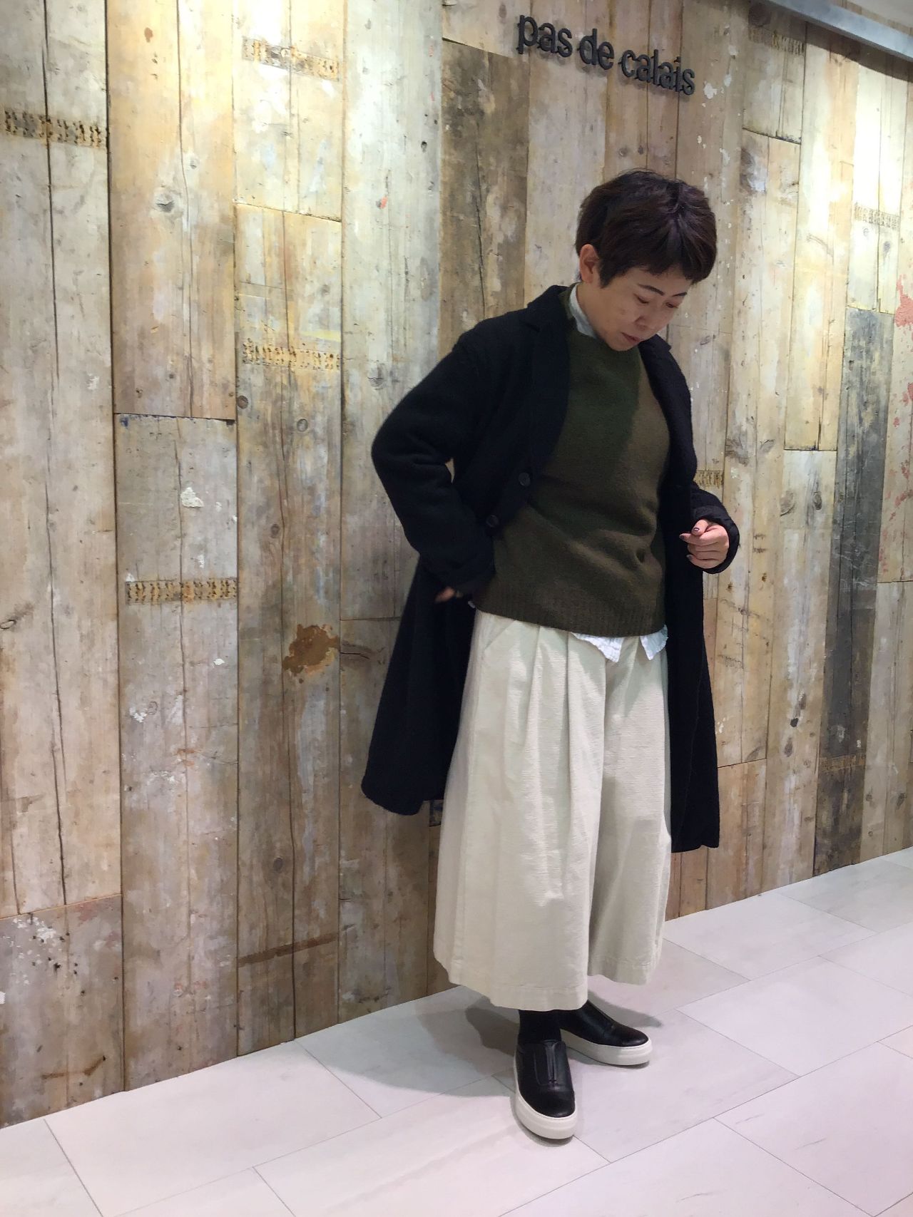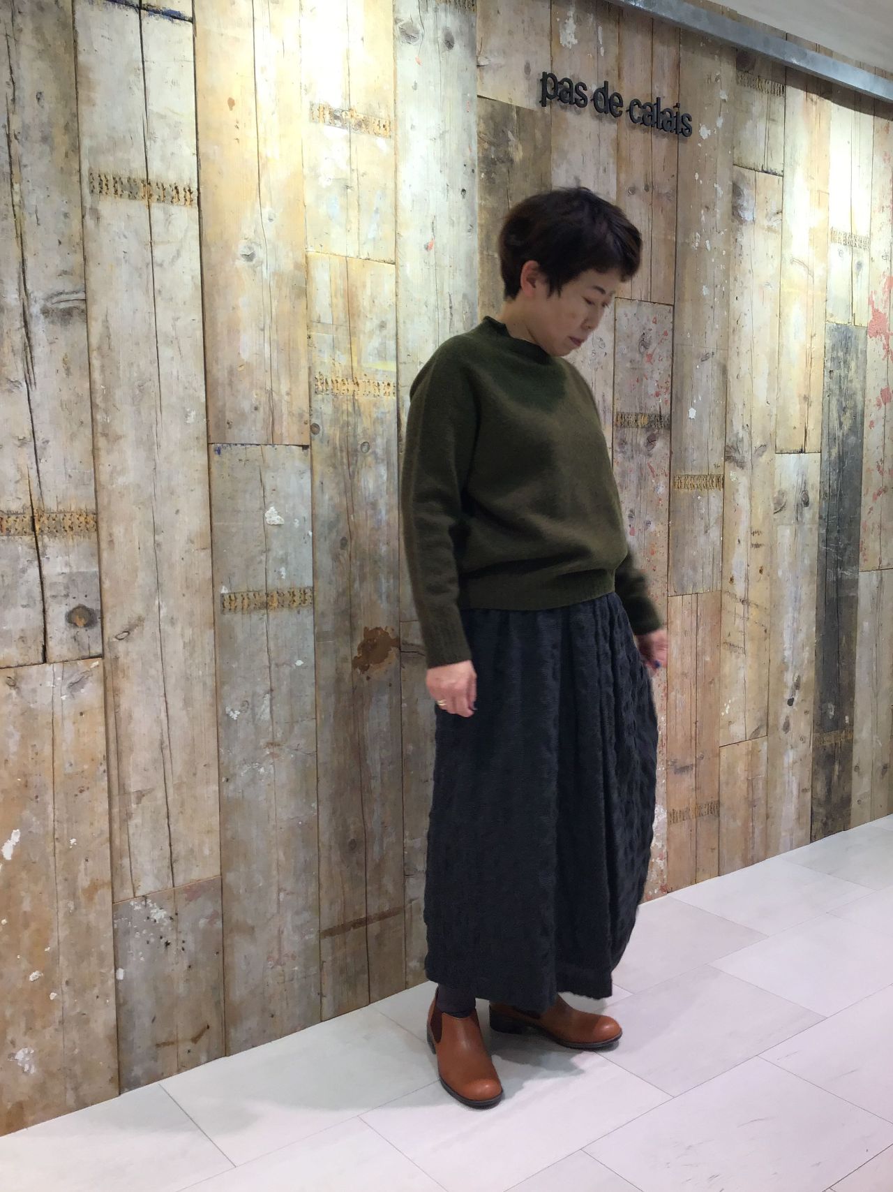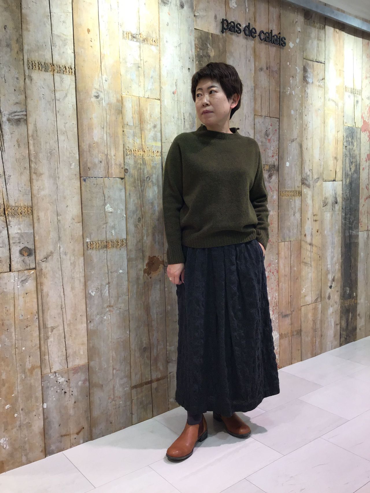 短めの丈感はこれからの季節、ボリュームのある靴下やブーツと合わせるのもオススメです。
