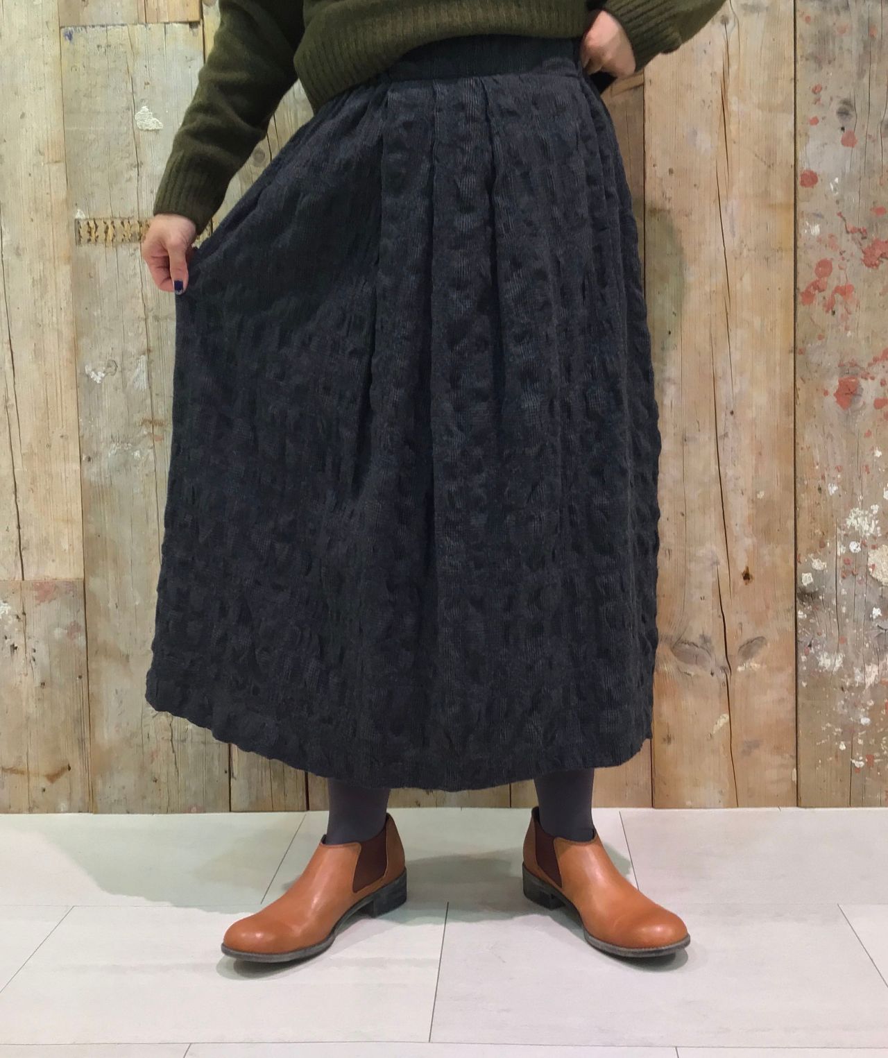 綿とウールの縮み方の違いを利用して立体感を出し、さらに洗いをかけてふんわり仕上げているので、見た目にも暖かいスカートです。