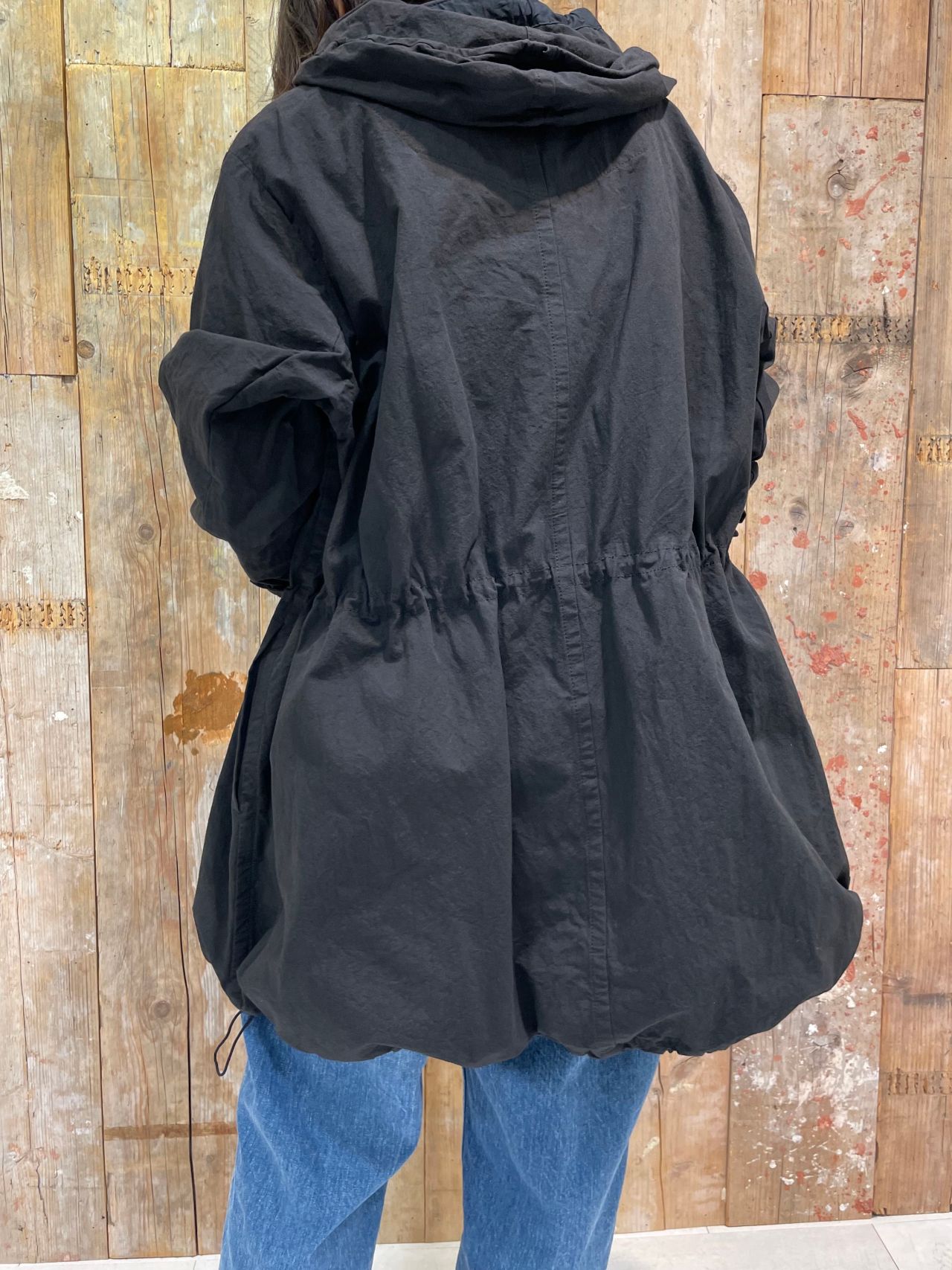 フード周り、ウエスト、裾にはゴムを通すことでシルエットの変化も楽しめるため、その日の気分に合わせた着こなしができます。