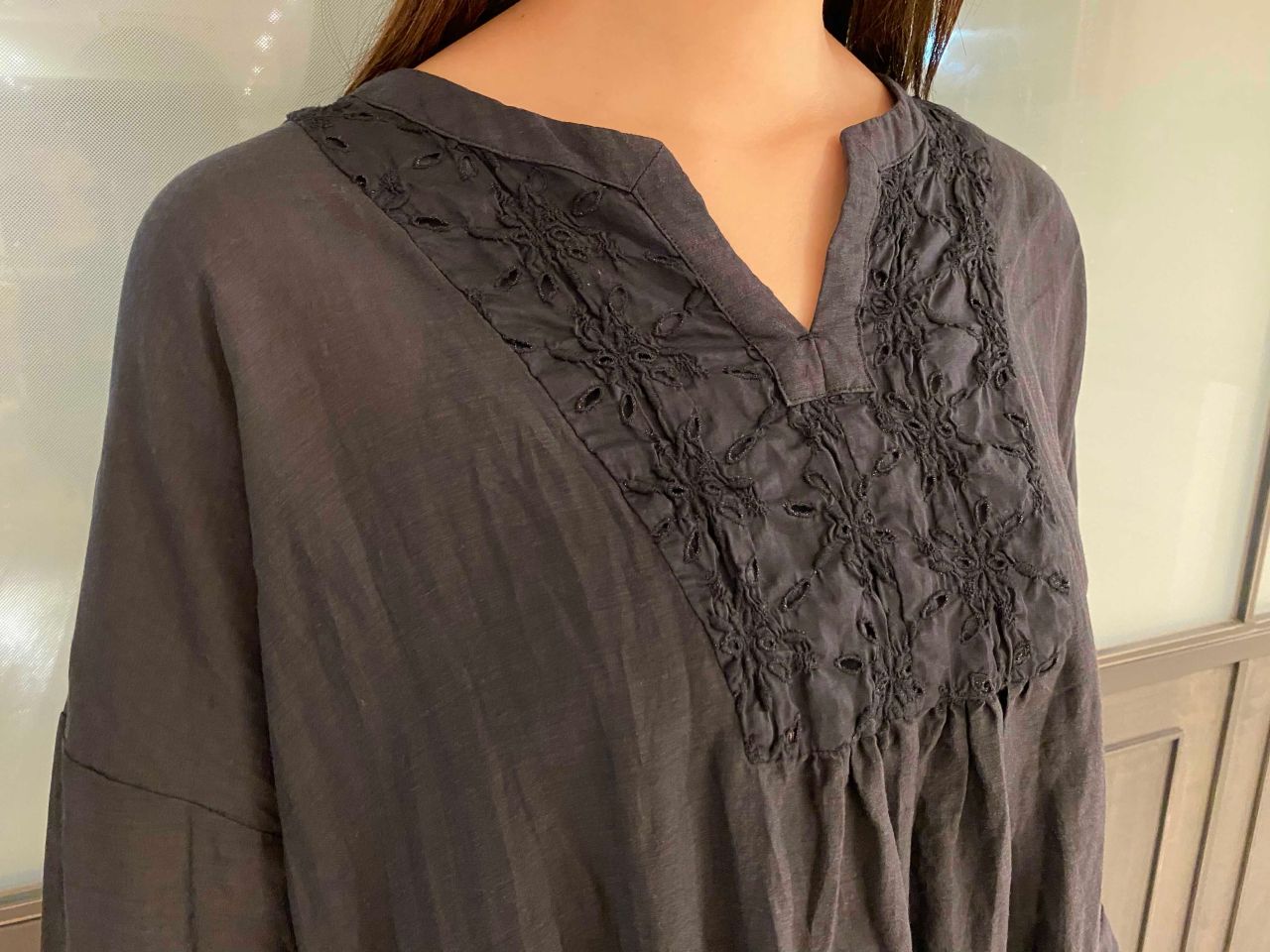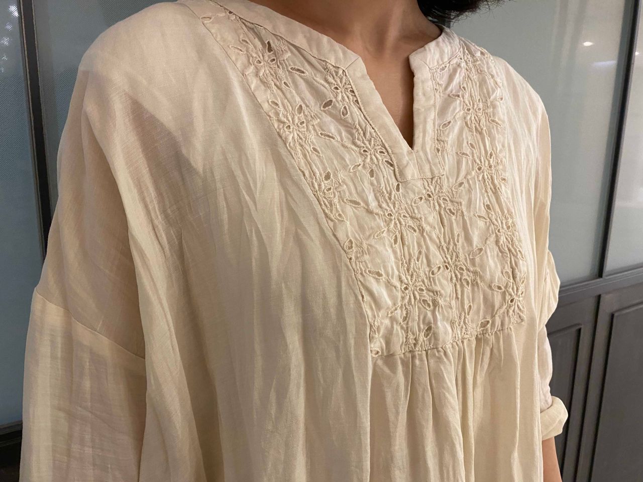 張り感がある為肌に張り付かないのが特徴で、汗ばむ季節にもサラッとして着れます。