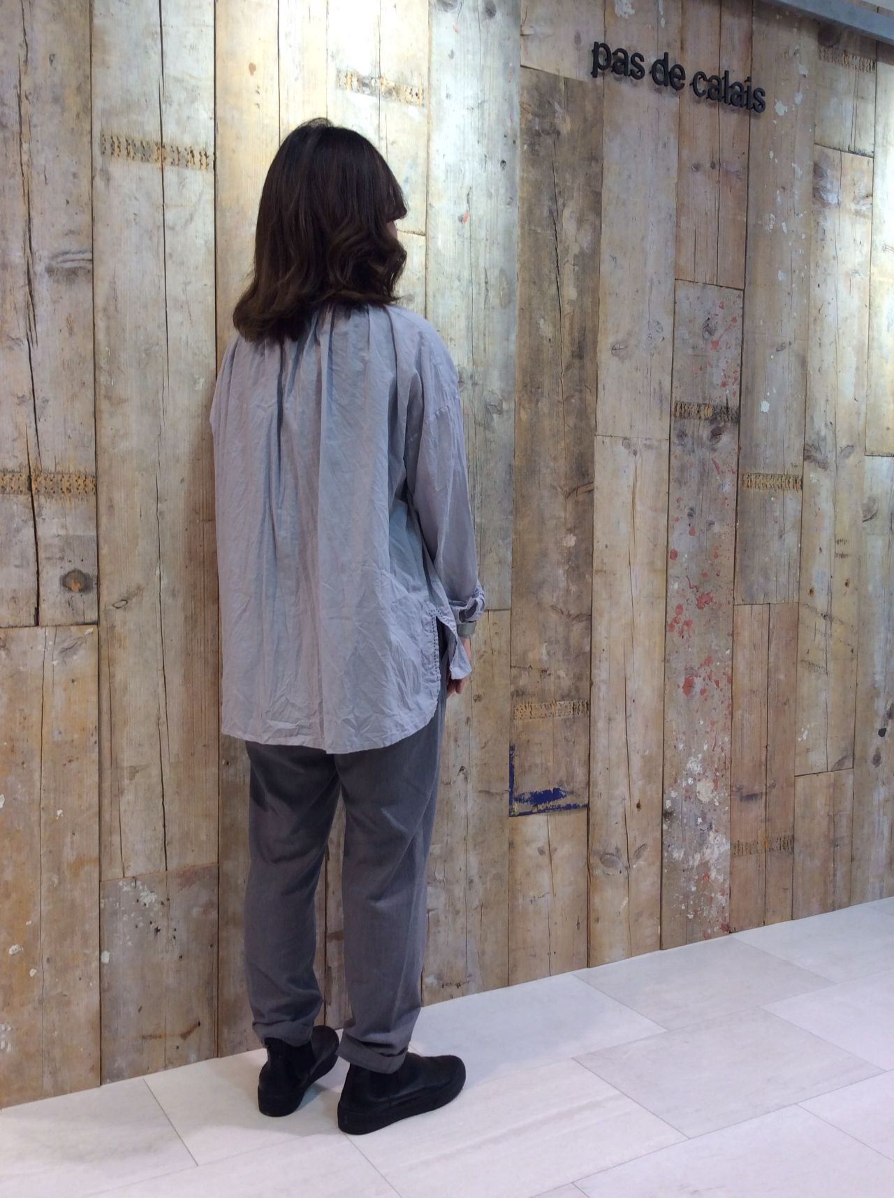 コートの中にコーディネートしたのは、綿麻素材のブラウスと、後ろゴムでストレッチのきいた履きやすいパンツです。