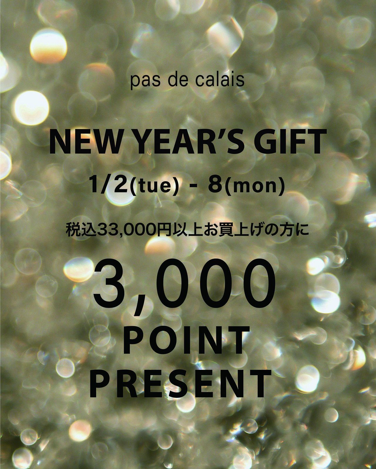 期間中、パドカレからのNEW YEAR'S GIFTとして、公式アプリダウンロード、税込33,000円以上ご購入で、その場で使える3000ポイントプレゼント。