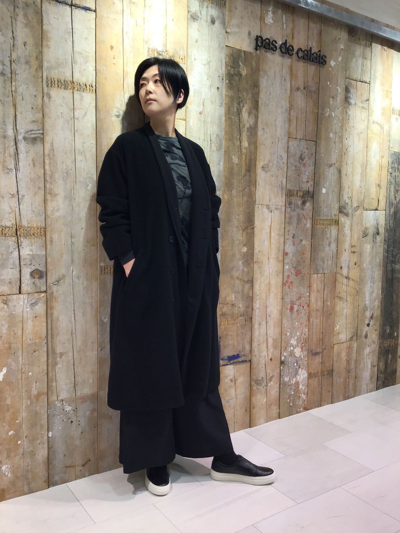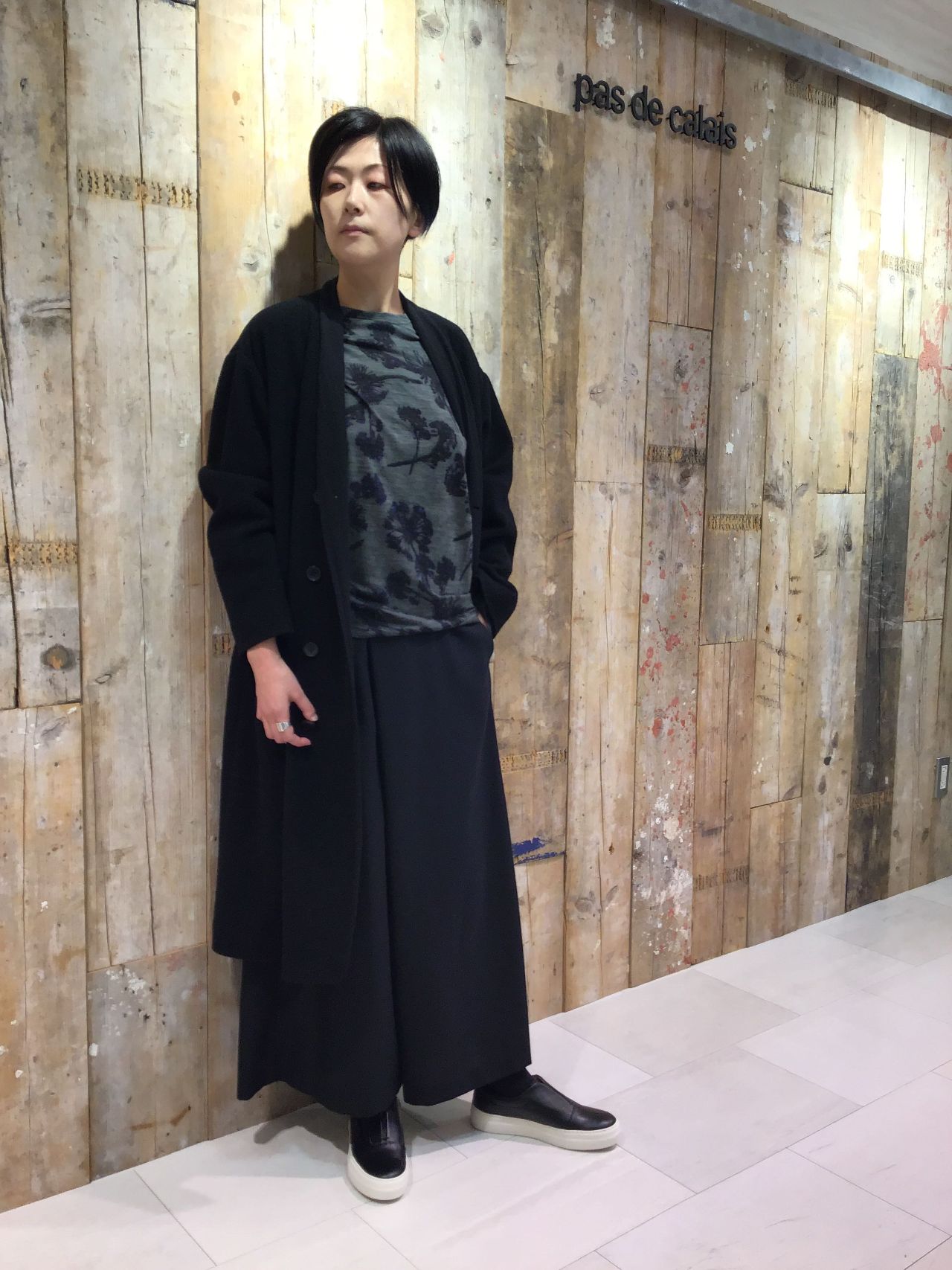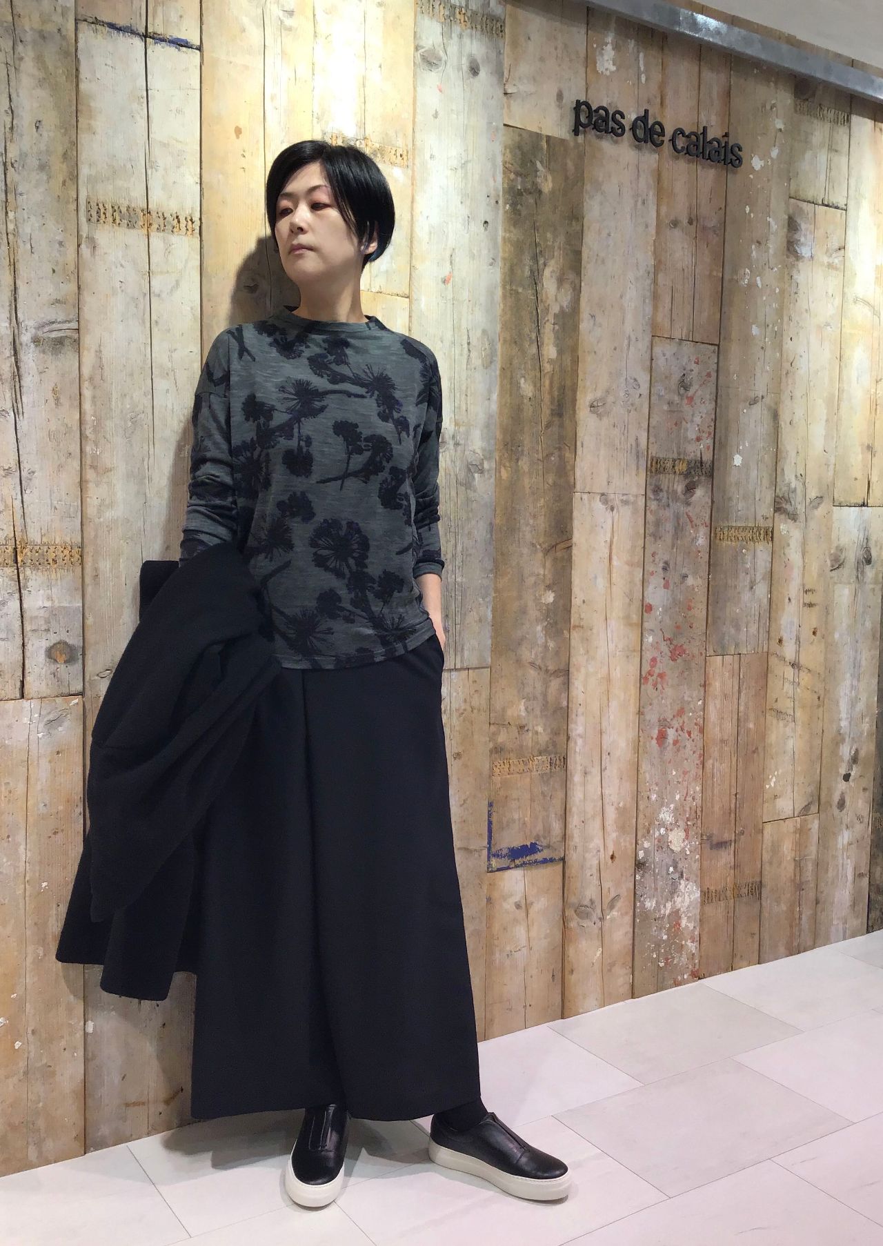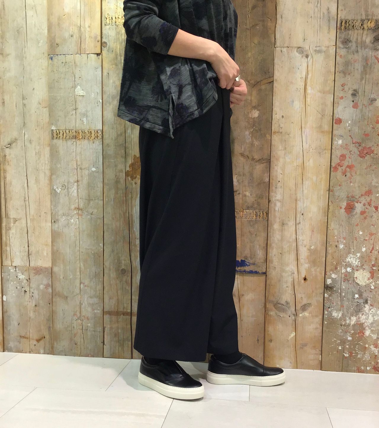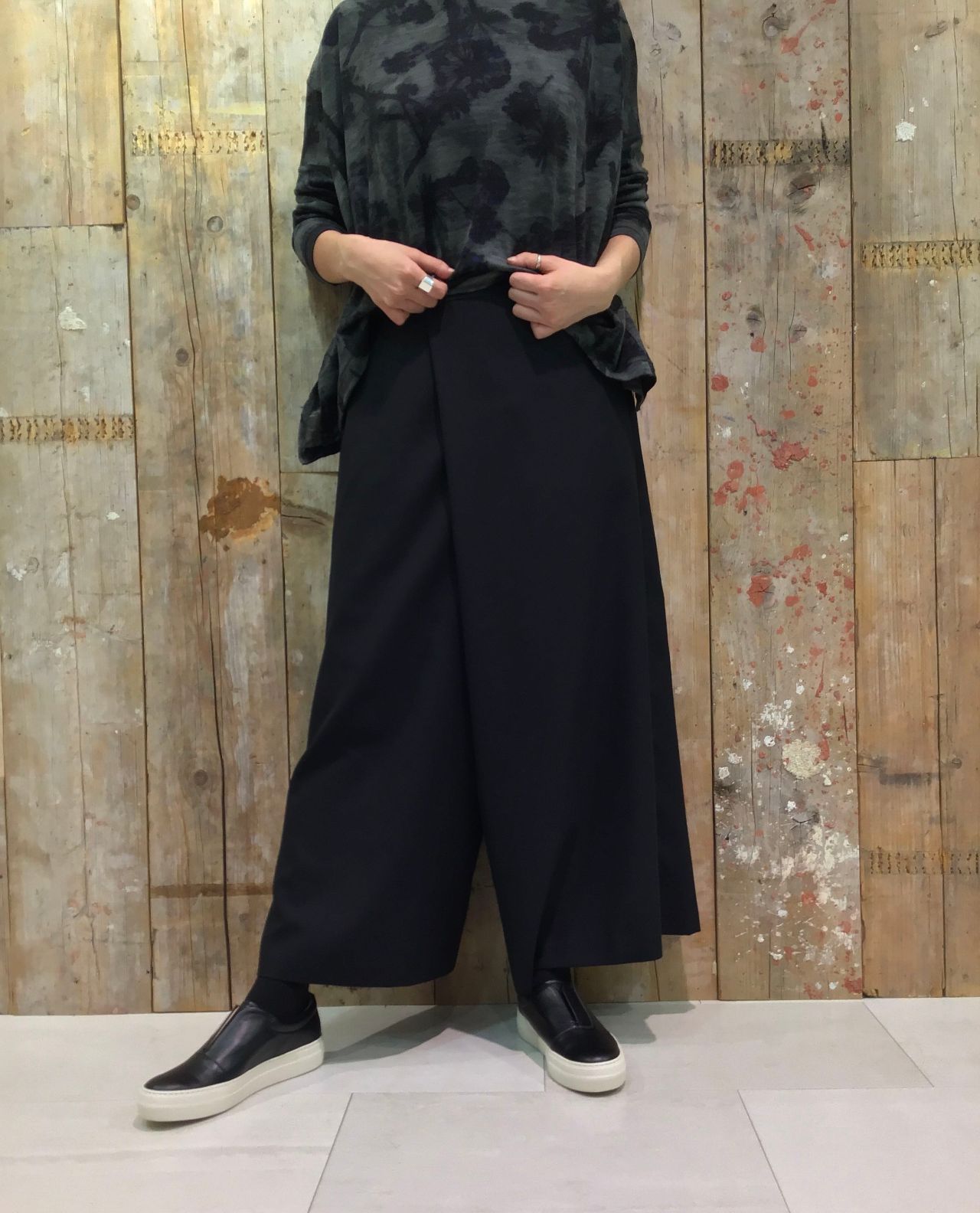 1枚でも着ていただけますが薄手素材となっているのでニットとの重ね着でチラッと柄を見せたコーディネートもオススメです。
