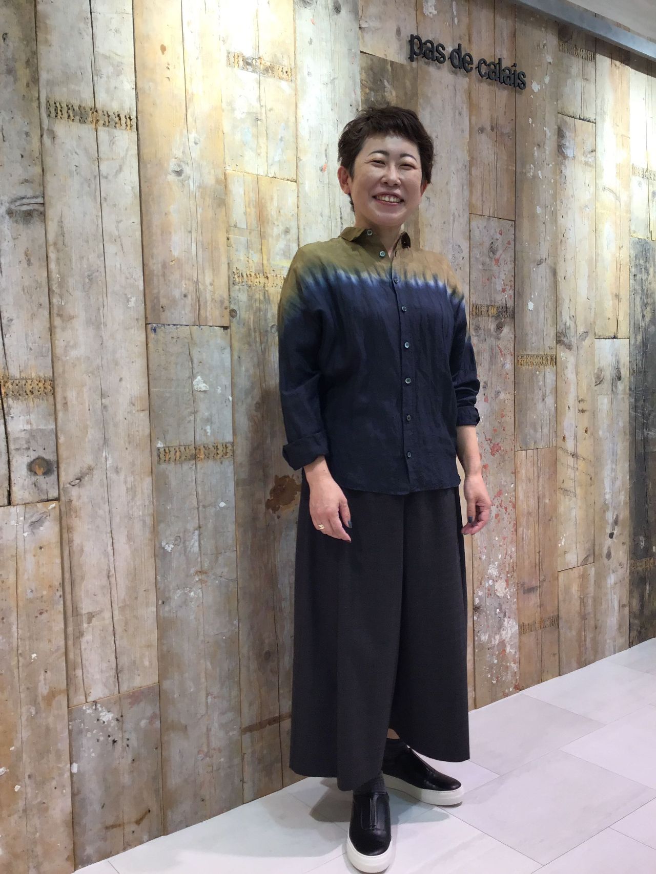 今回はサルエルパンツと合わせましたが、同シリーズのスカートと合わせてワンピースのような着こなしもオススメです。