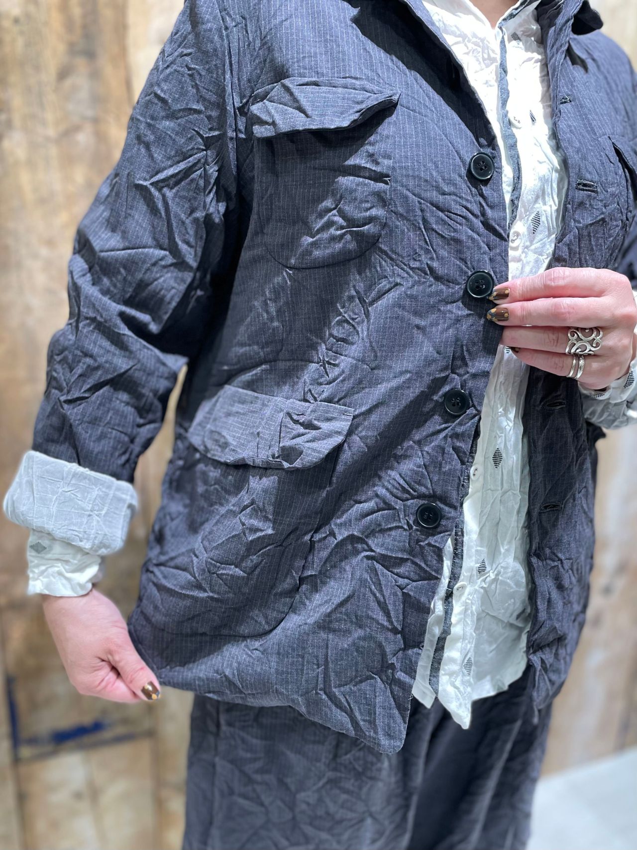 遊び心のあるポケットがポイントのジャケットは、コンパクトなサイズ感で前を閉めてブラウスのように着ても。