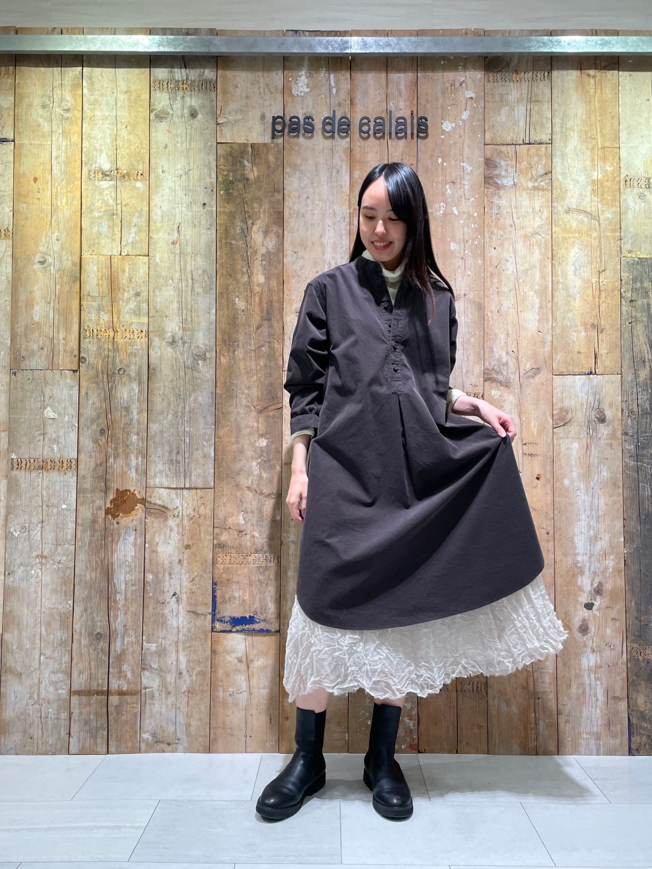 パンツやスカートとのレイヤードスタイルを楽しんで頂くため、あえて着丈を短めに設定しています。