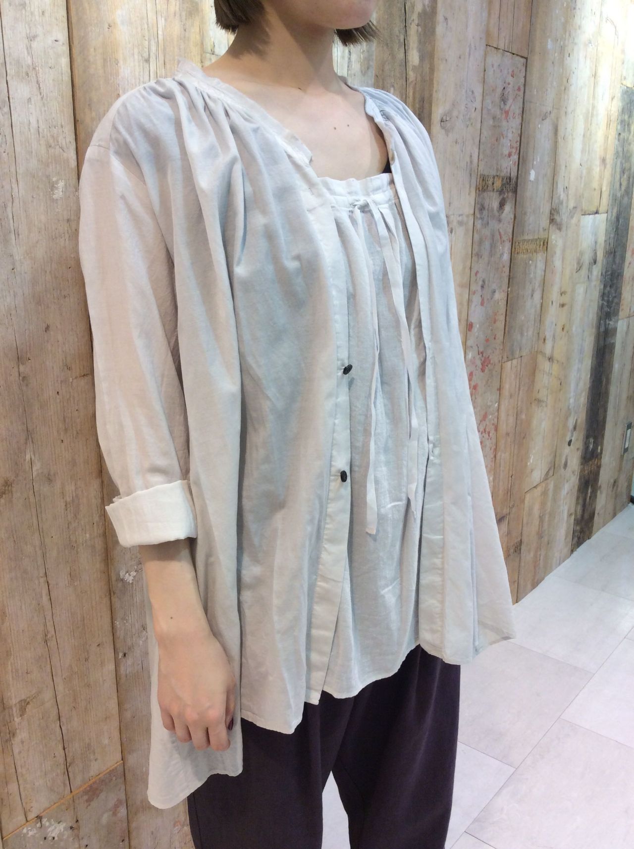 前ボタンを閉めて重ね着風に、開けてラフにとシルエットの違いを楽しんで頂けます。