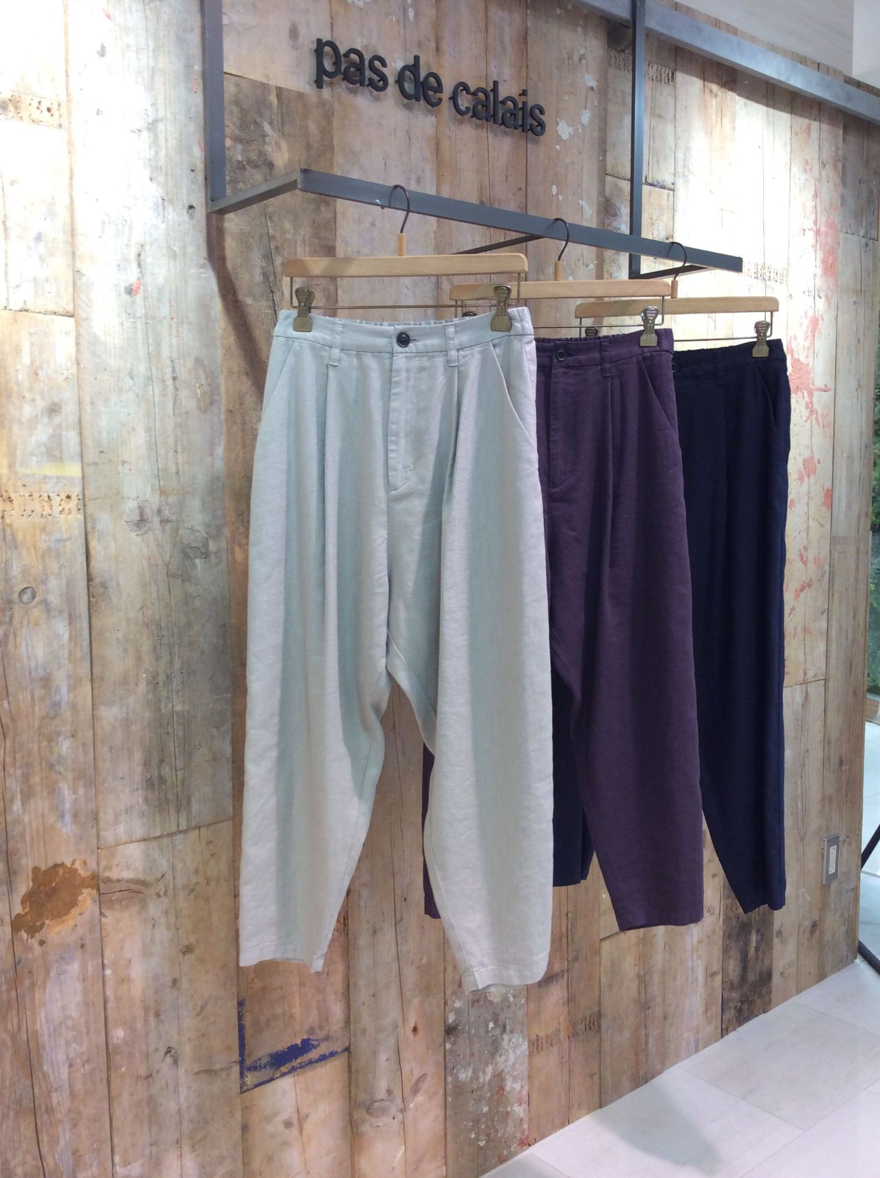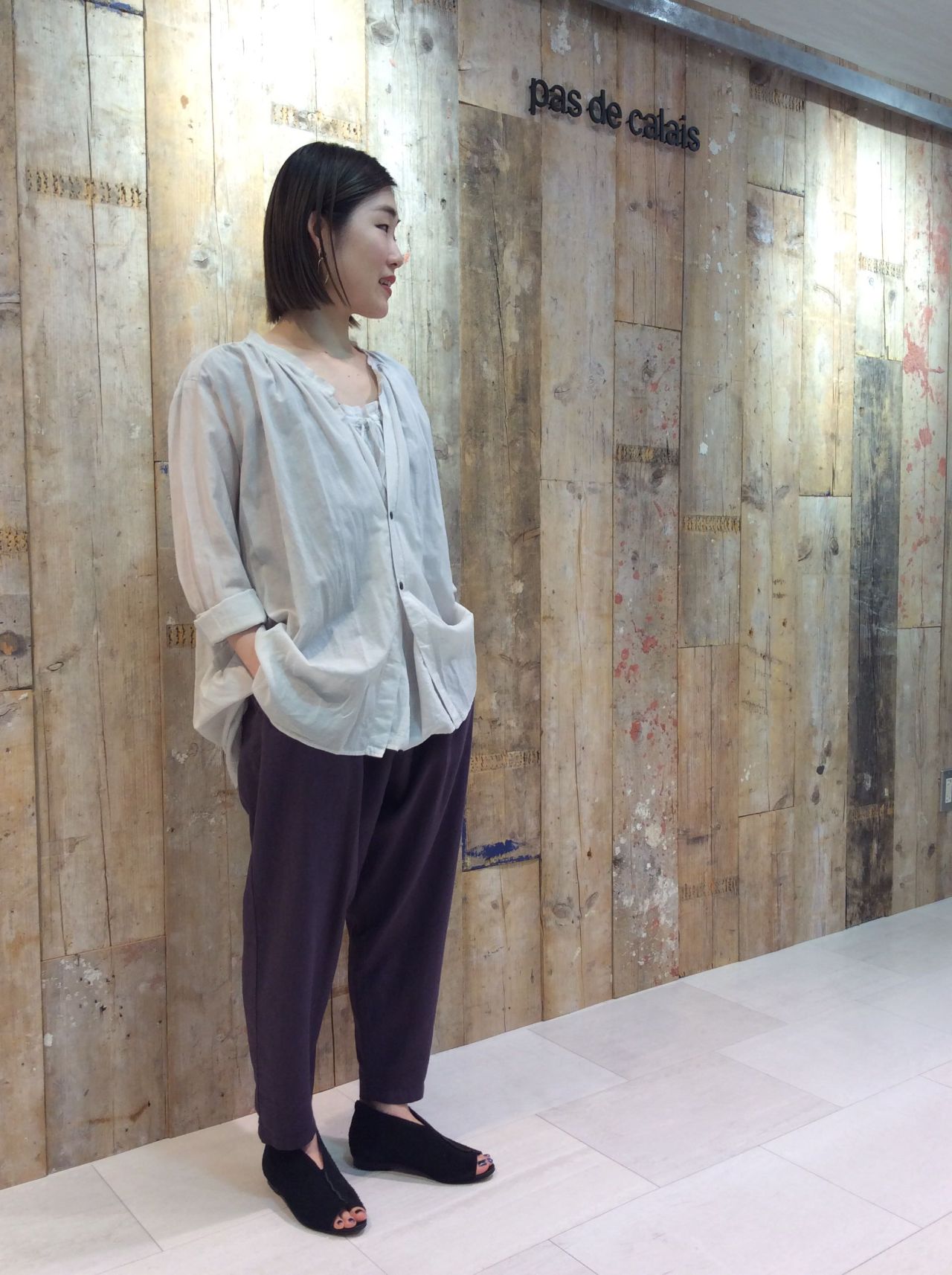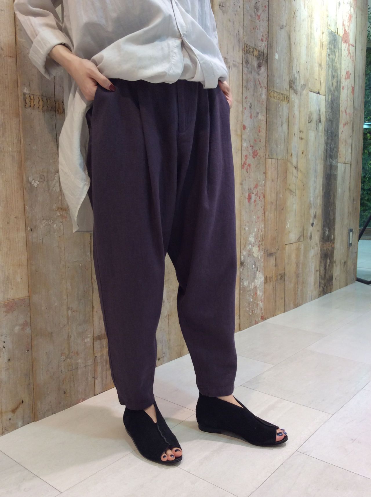 薄手の綿とキュプラ素材のブラウスと、落ち感のあるテンセルと綿麻素材のパンツです。