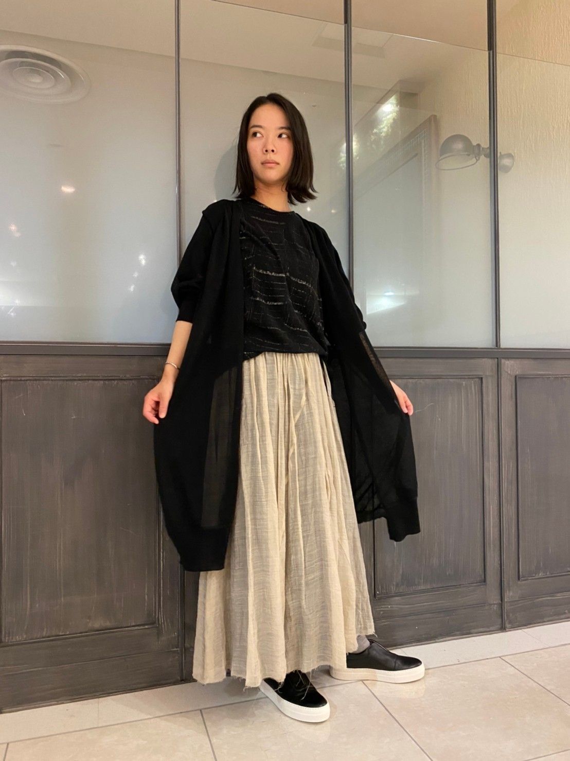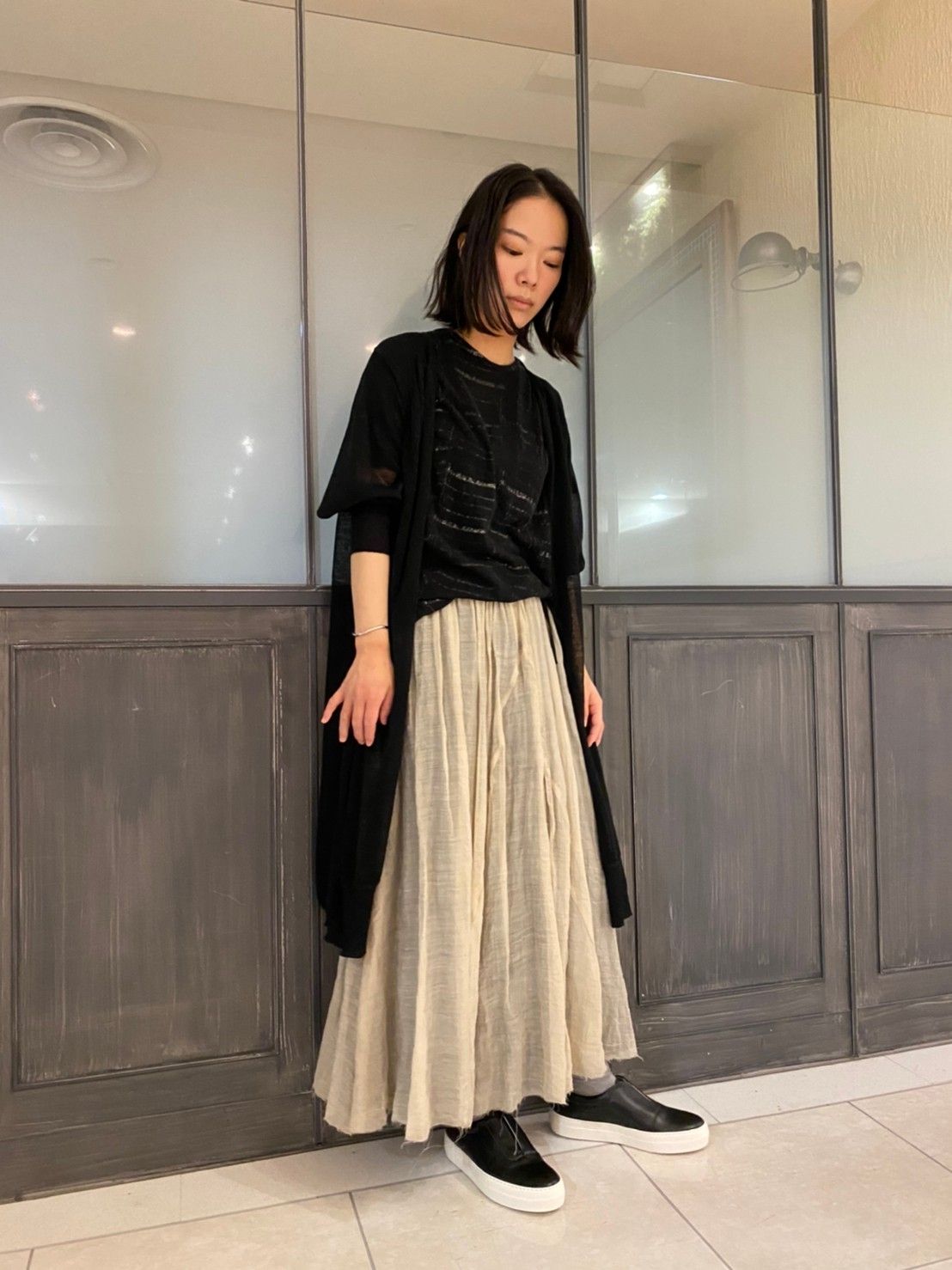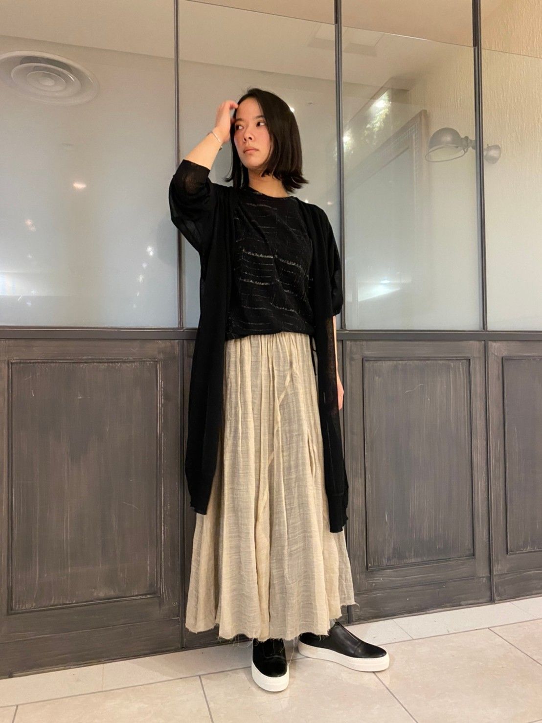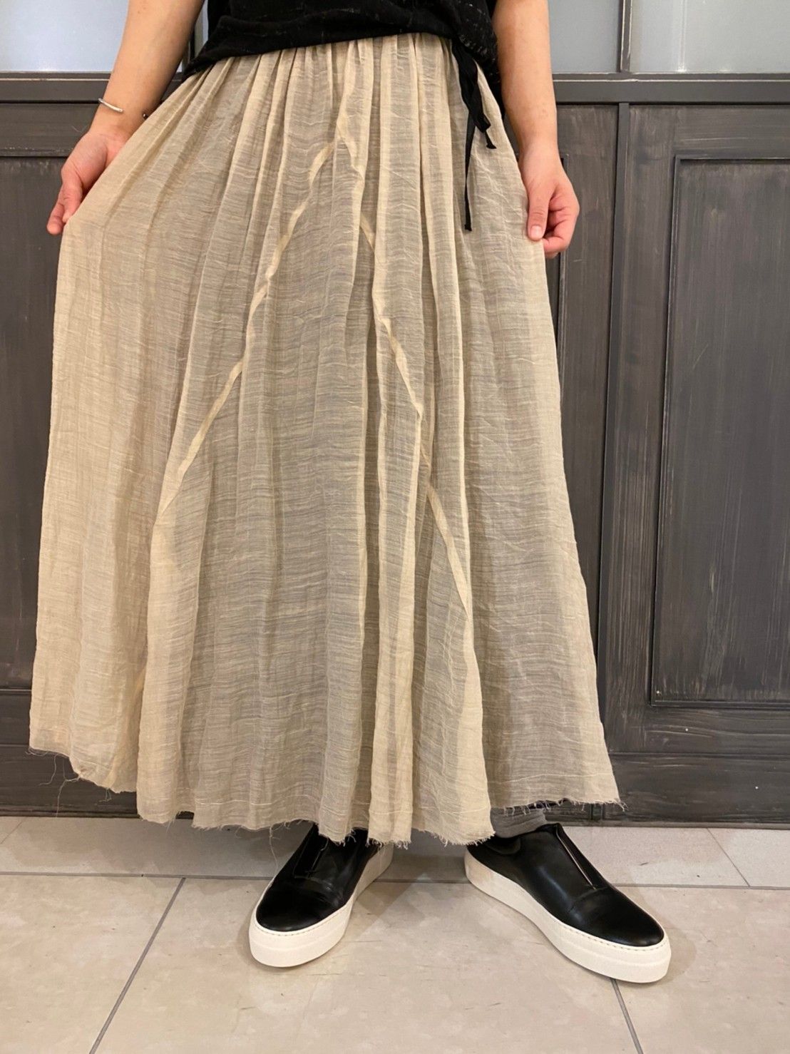 スカートは透け感があり天然繊維の中でも、吸湿発散性に優れた涼しげなラミー素材を織り交ぜた快適な素材。