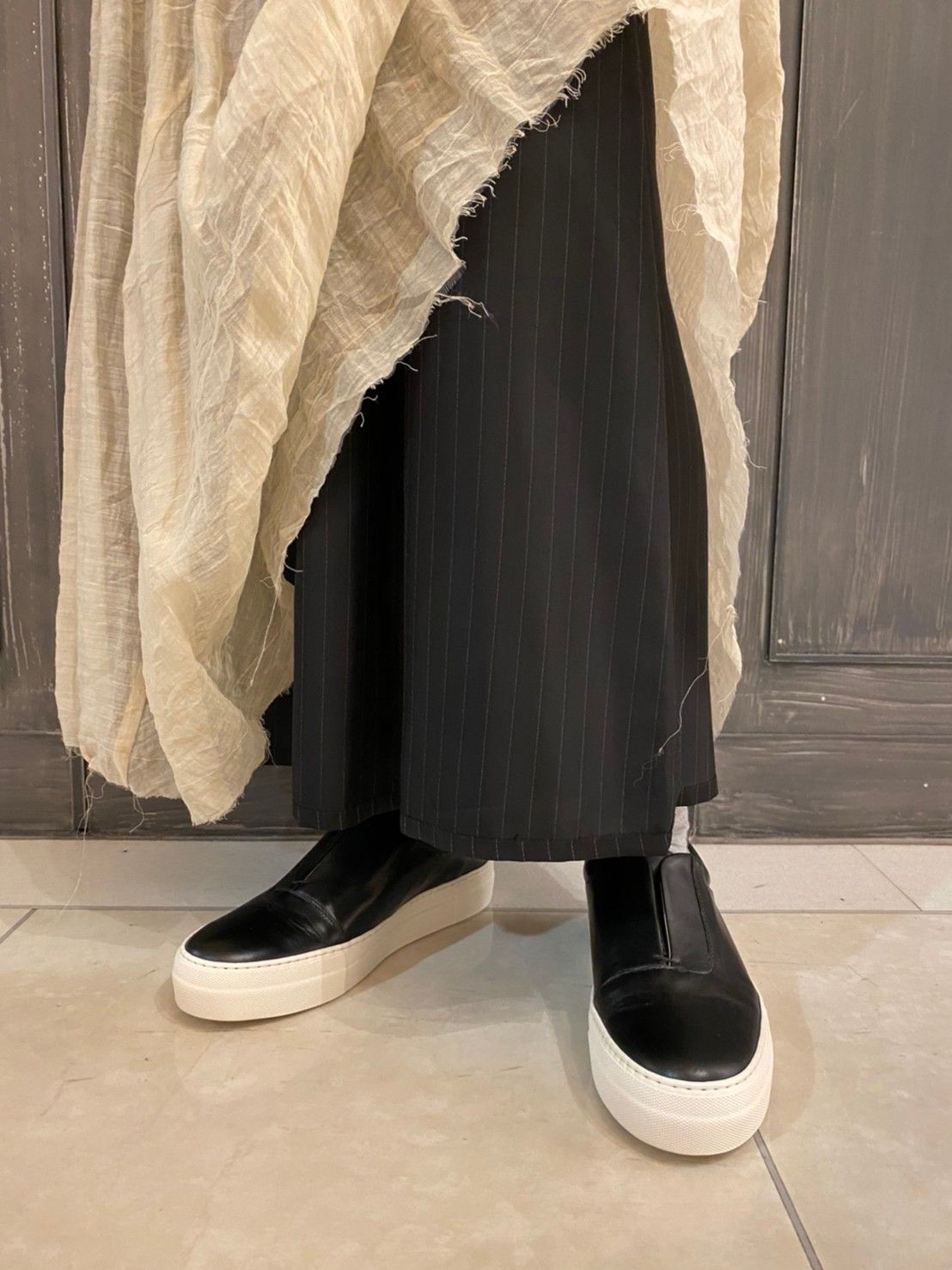 普段はシンプルにTシャツの合わせもオススメですが、ブラウスやジャケットなどと合わせることで一気にモードな印象に。