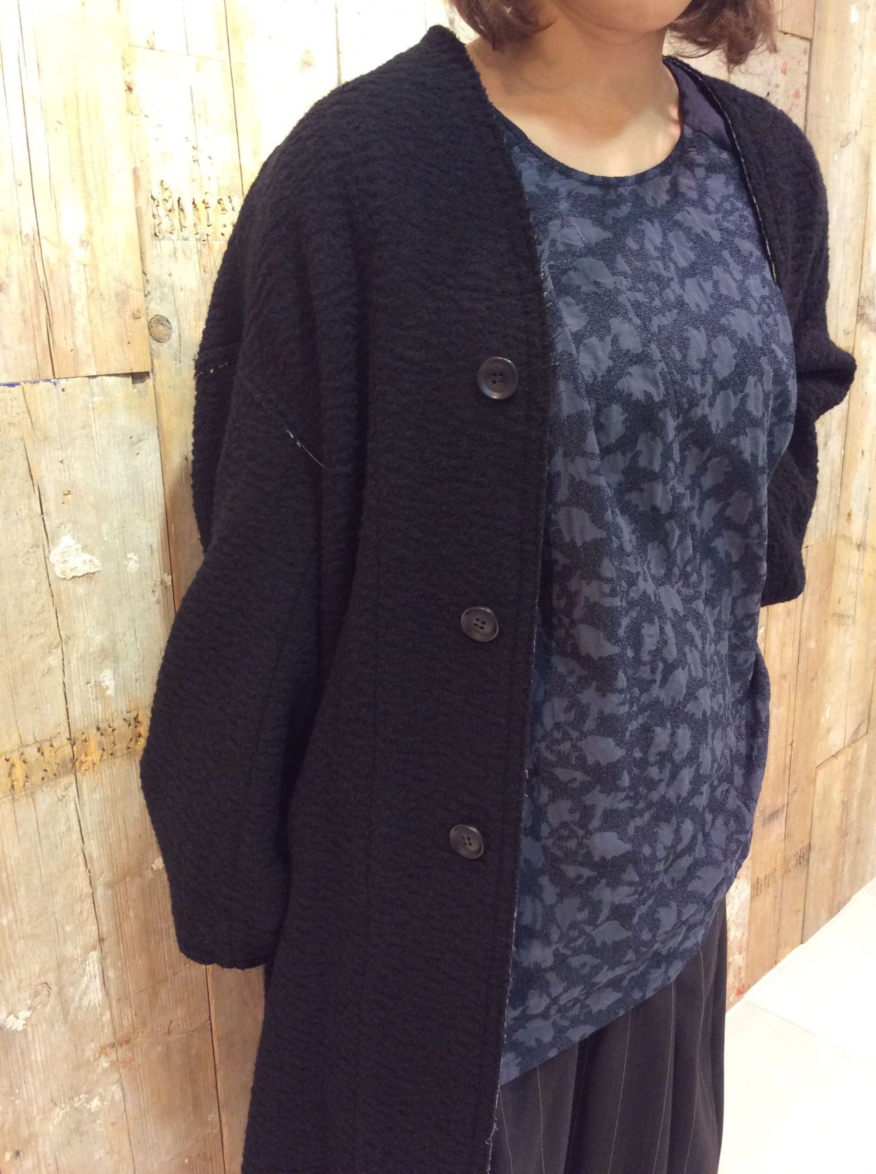 本日ご紹介するのは、表面を起毛させ見た目にも暖かな、ウール素材のコートです。