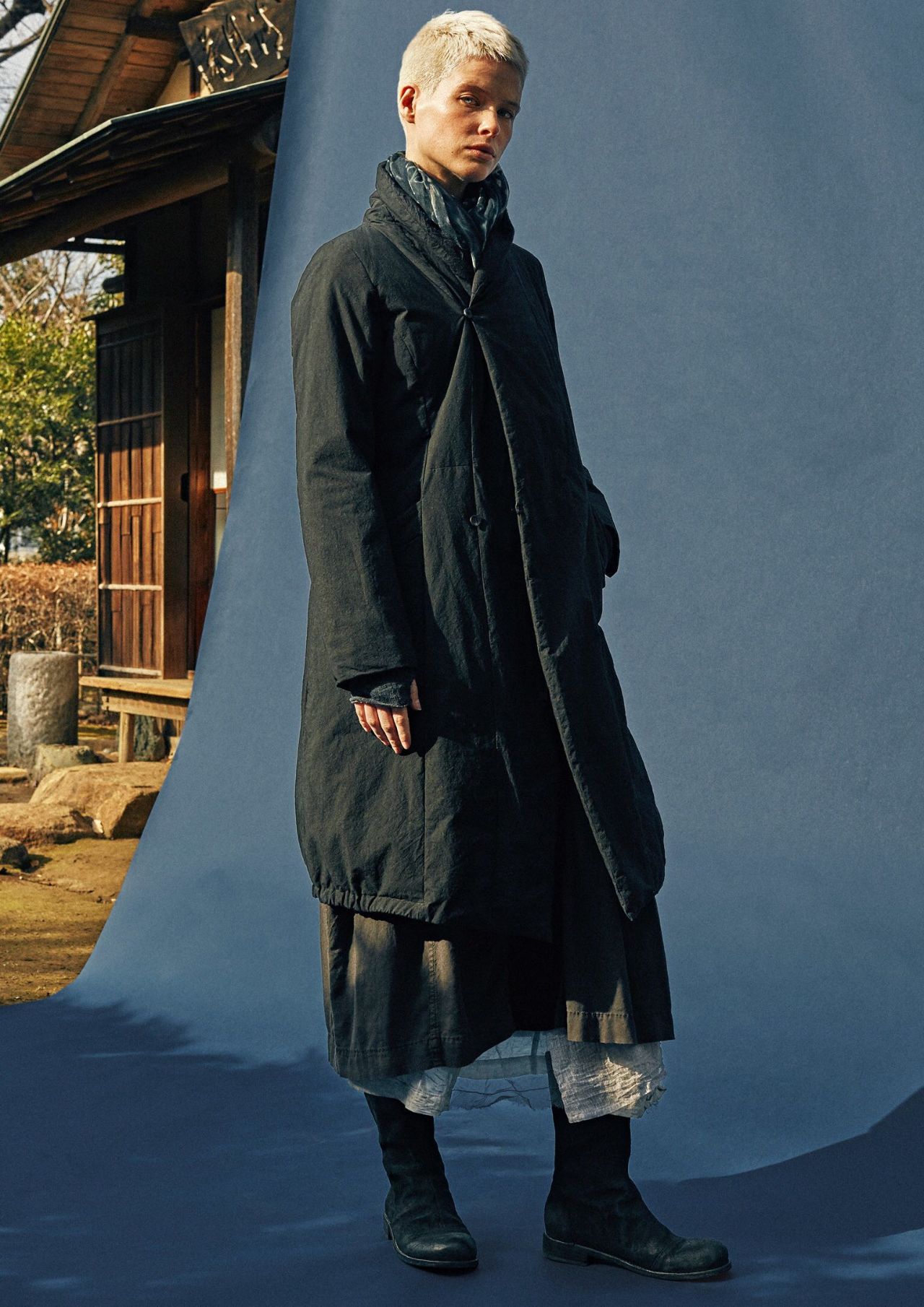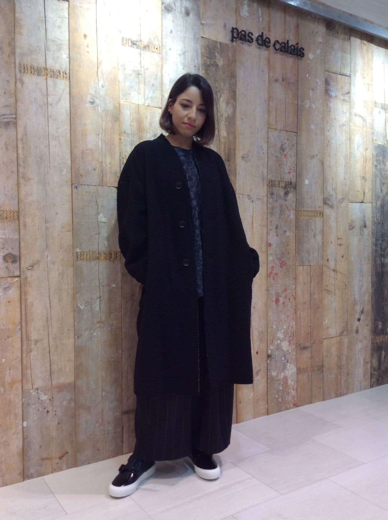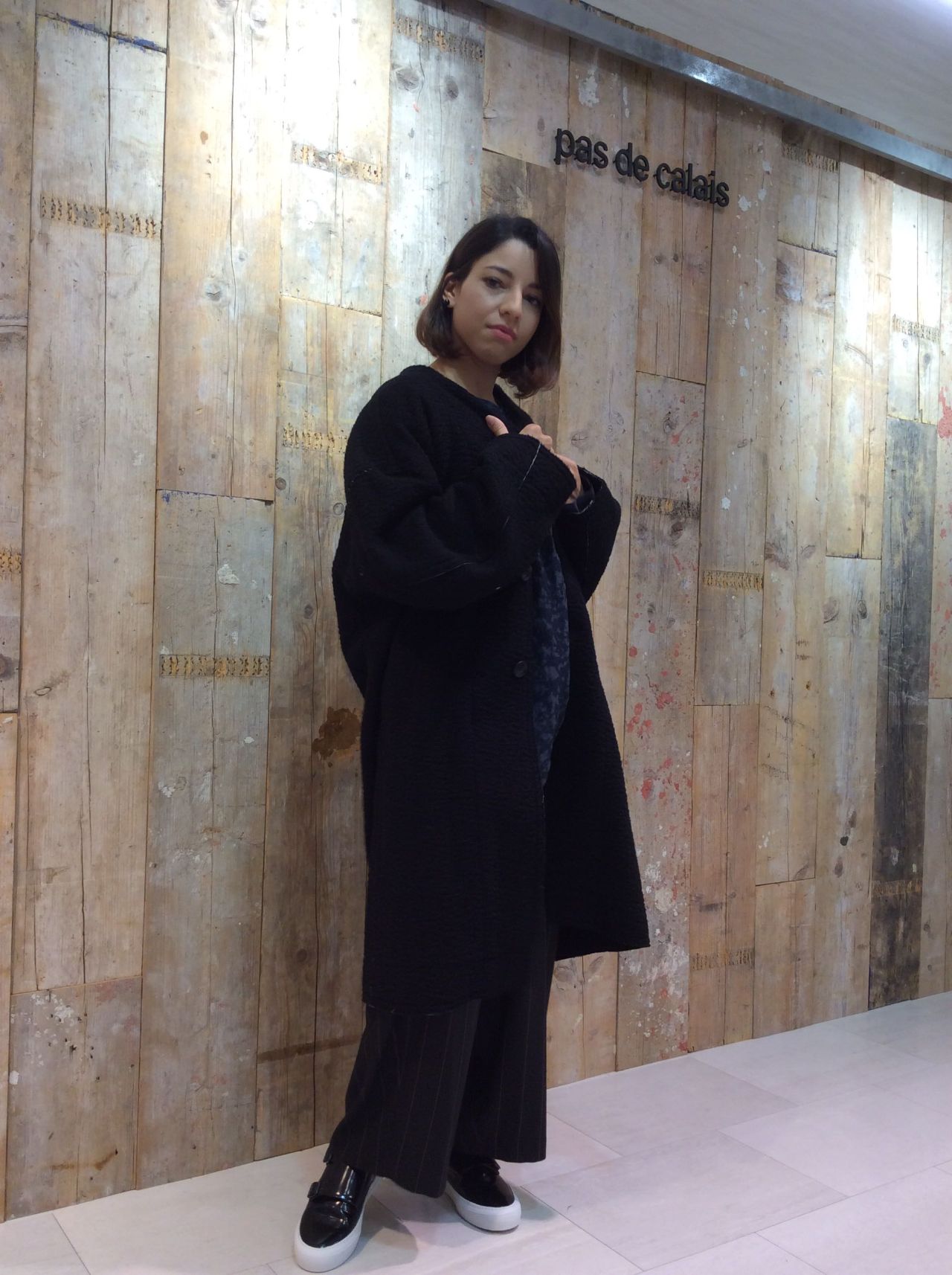 パンツにもスカートにも合わせやすい丈のコートです。