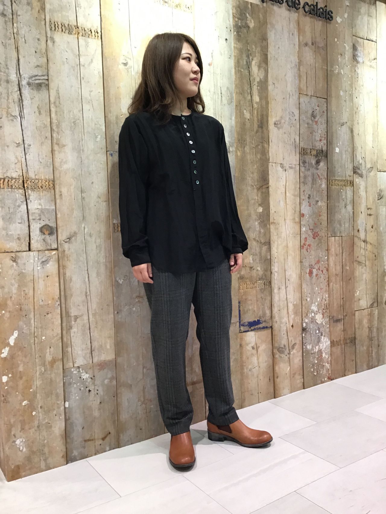 首元が開きすぎないのとゆとりがあるブラウスですが、落ち感があり、体に沿ってくれるので、中に薄手のタートルネックを入れても綺麗なスタイルになりますね。