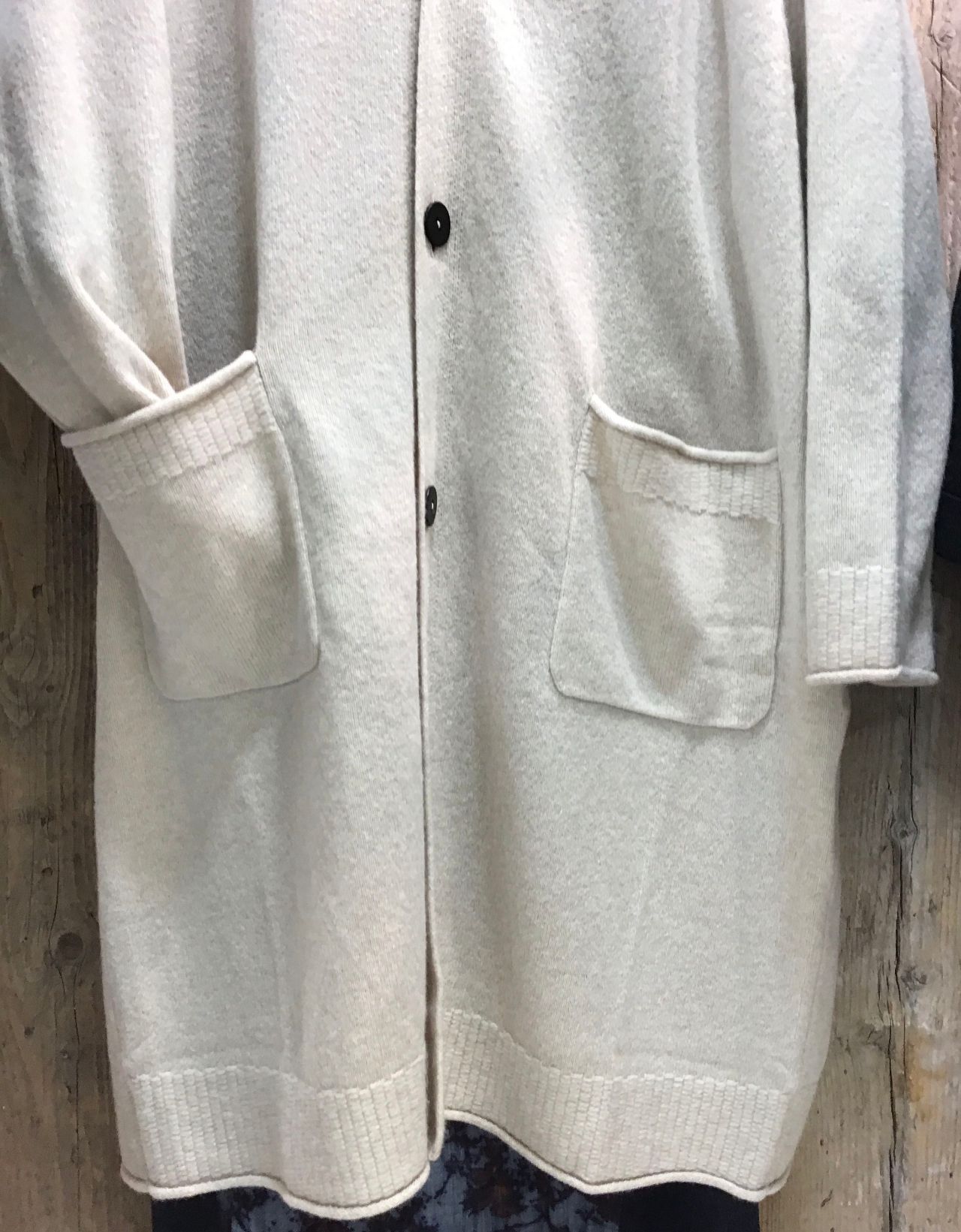 ゆったりとしていてコートの様なニットローブです。丈感が長すぎないのでざっくり着られて、一枚羽織りが欲しいときにサッ羽織られる1枚ですよ。お袖やポケットにあしらわれたステッチが、さりげないポイントになっています。