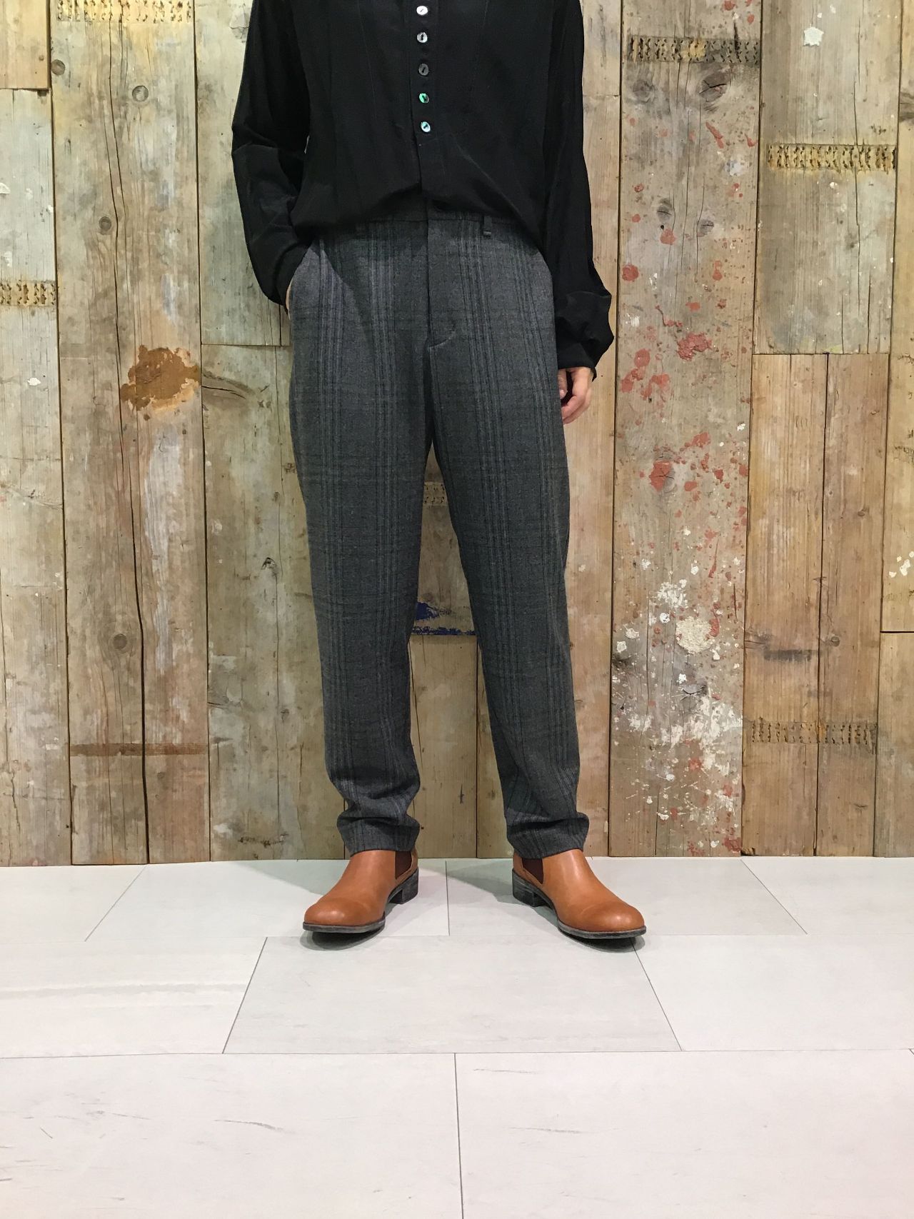 オリジナルブレンドのレーヨン、ポリエステル、ウールの混紡糸が入っており、柔らかさとウールの温かみを出した薄手のルーズスキニーパンツです。ストレッチも入っている為、細身でありながら履き心地が
