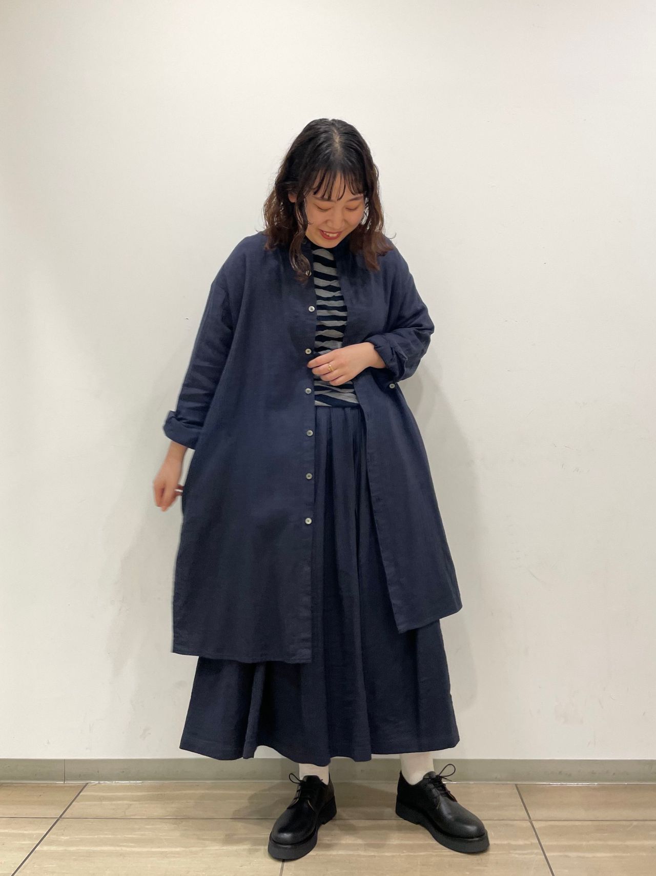今回は同じ生地のスカートを合わせたセットアップで、インナーにもネイビーを入れた落ち着きのあるコーディネートーにしました。