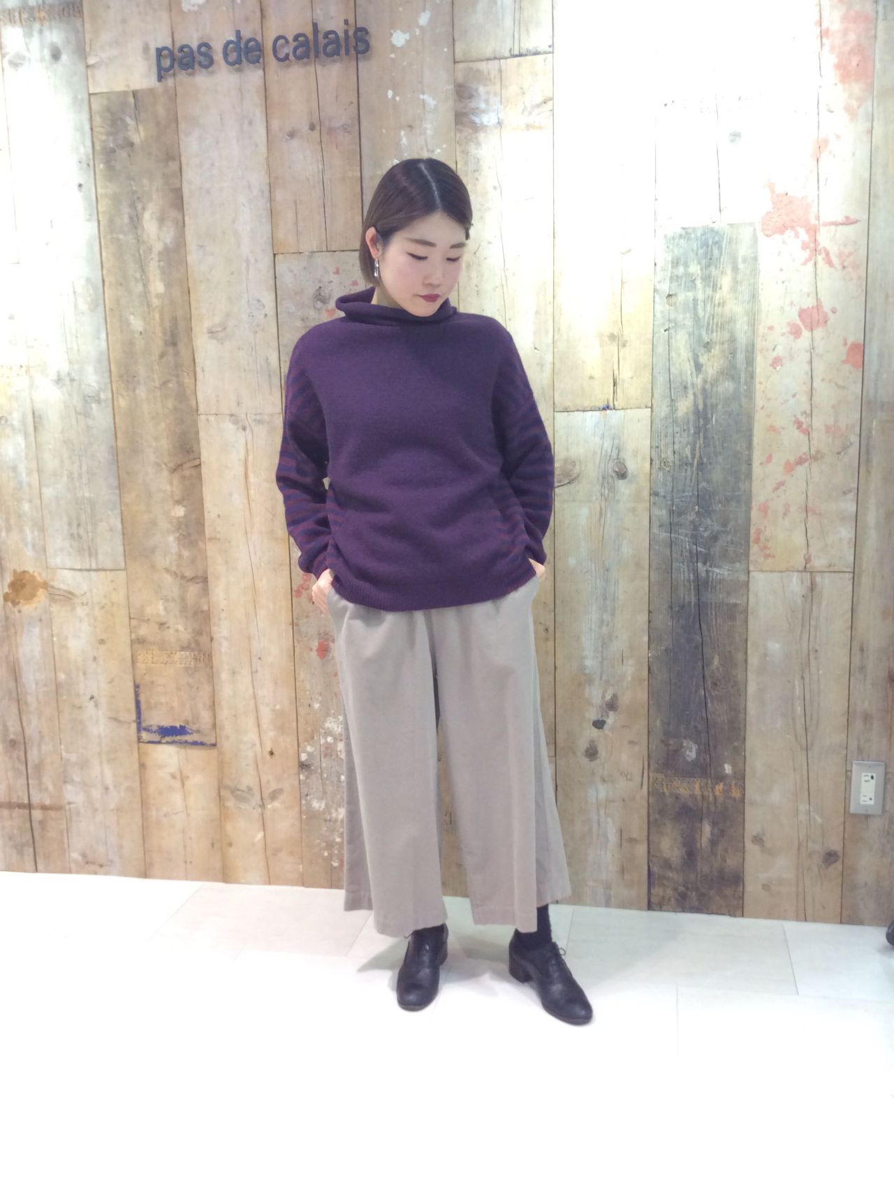 本格的に寒くなって参りましたので、ウールとアンゴラ素材の暖かなニットと、畝の細いコーデュロイ素材で、すっきりしたシルエットのパンツをご紹介します。