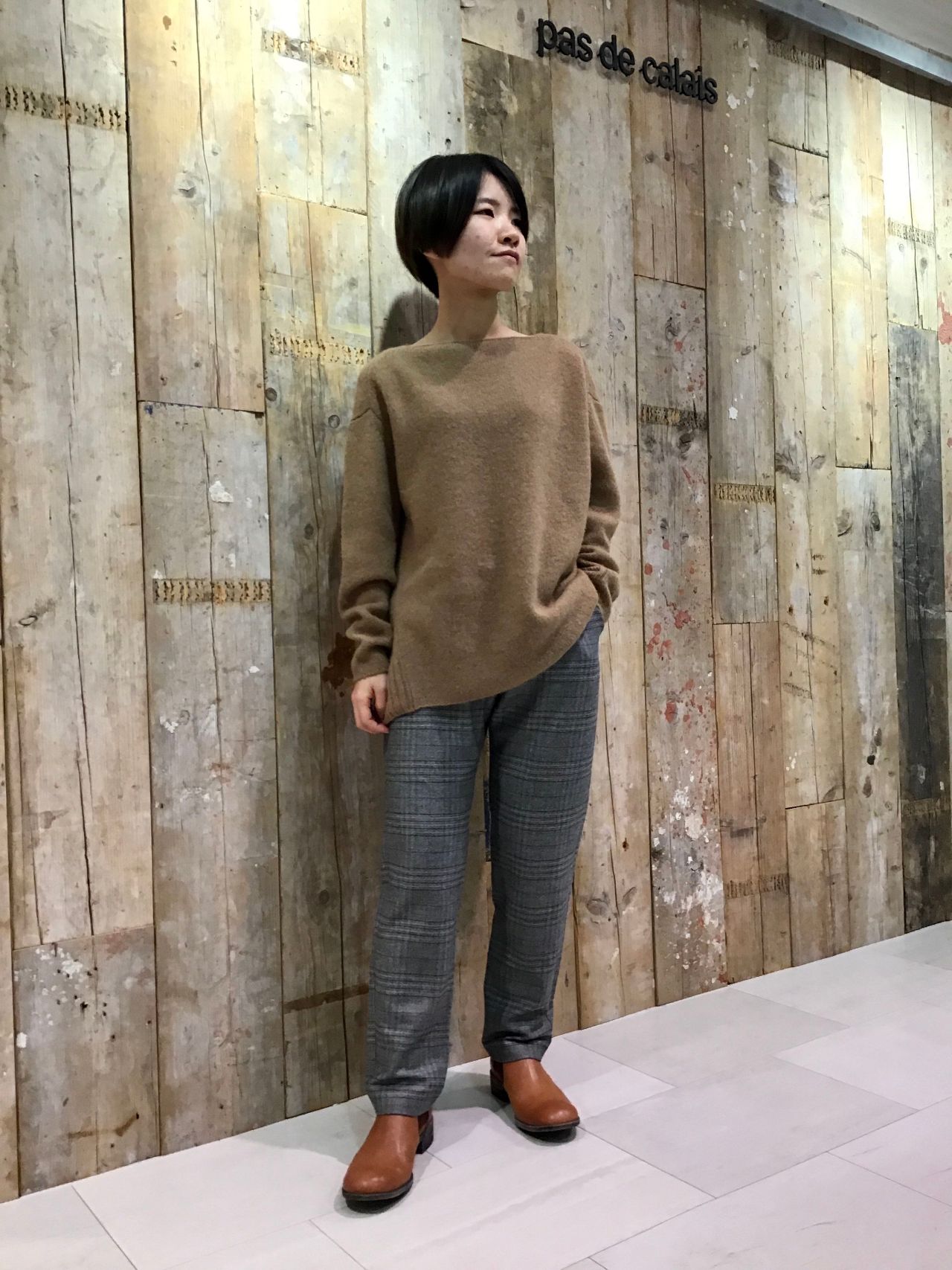 ニットとチェック柄のパンツで合わしてみました。ちょっとメンズ風な着こなしです。