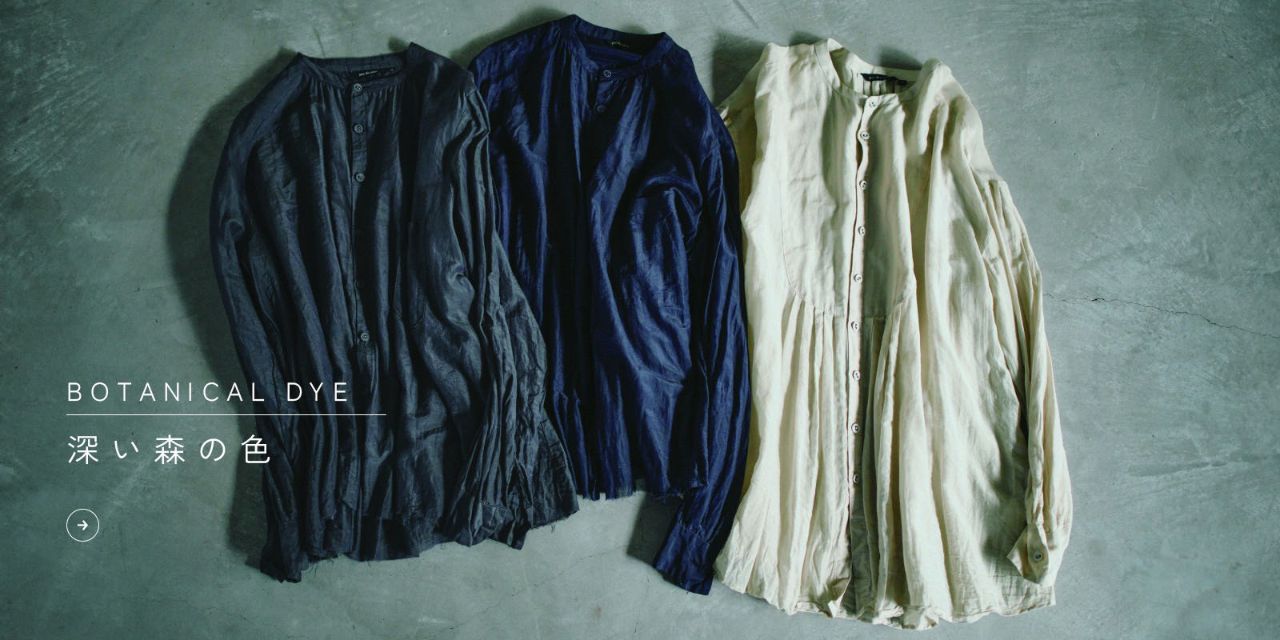 植物でのボタニカルダイを施した、スタンドカラーブラウス。