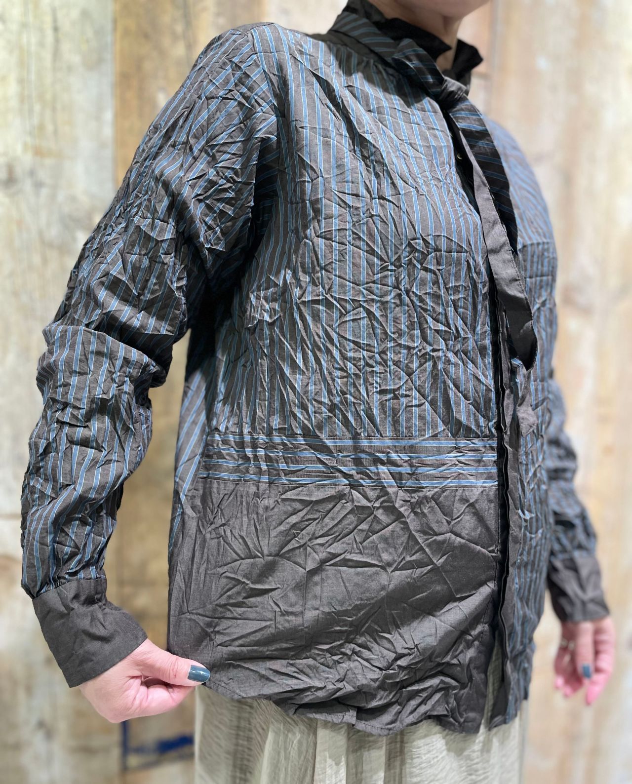 胸元のマットゴールドの釦や、クラシックな配色でアンティークのような雰囲気のブラウス。