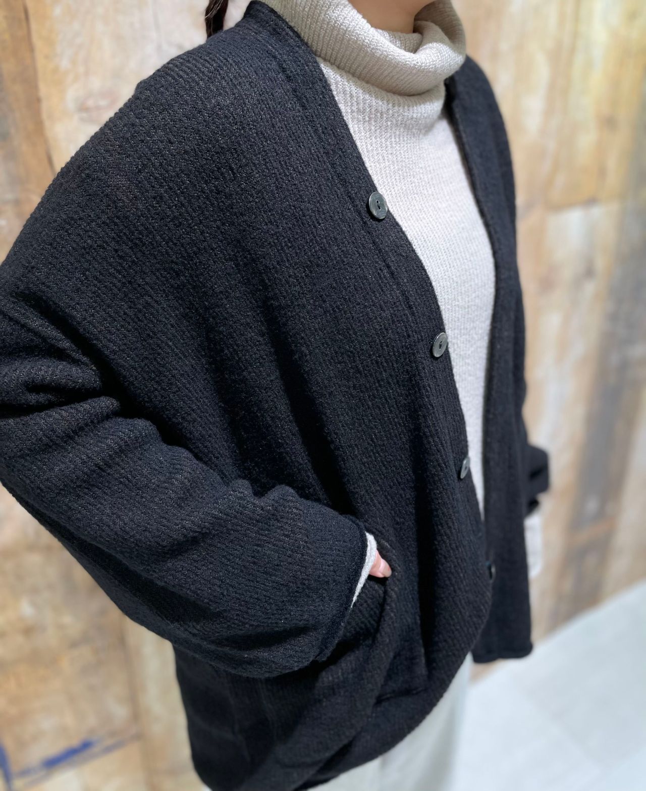 エクストラファインウールを使用した、ブークレーヤーン(=小さな輪っかのある糸)はとても軽く、柔らかな肌触りが特徴。